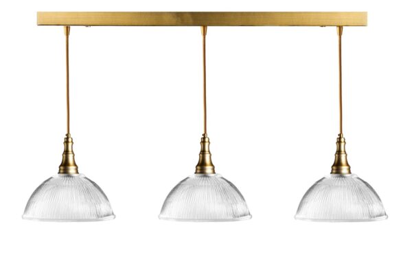 . פס ברזל בצבע פליז, צמוד תקרה באורך מטר, ממנו משתלשלים 3 גופים על כבל בד זהב, חובק מאורך וכוס זכוכית עגולה עם פסים