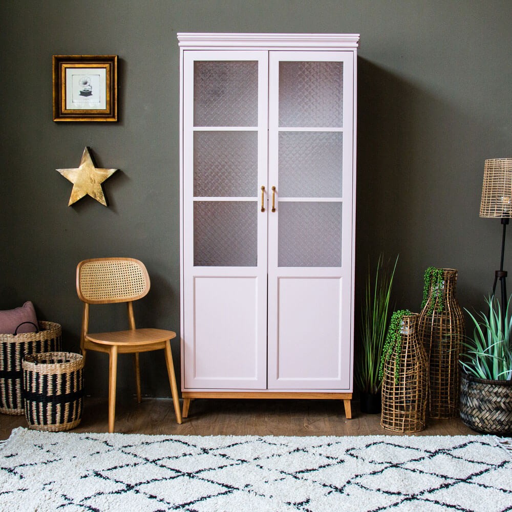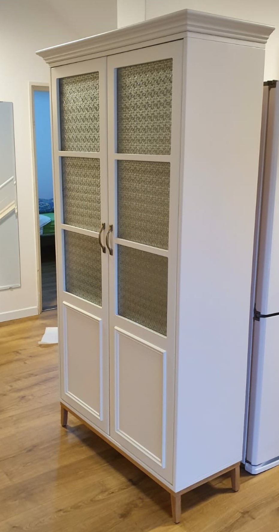 ארון ויטרינה מעוצב בהתאמה אישית. בעל שתי דלתות בשילוב זכוכית סבתא וידיות בגוון פליז. צבוע בגוון שמנת מעושנת
