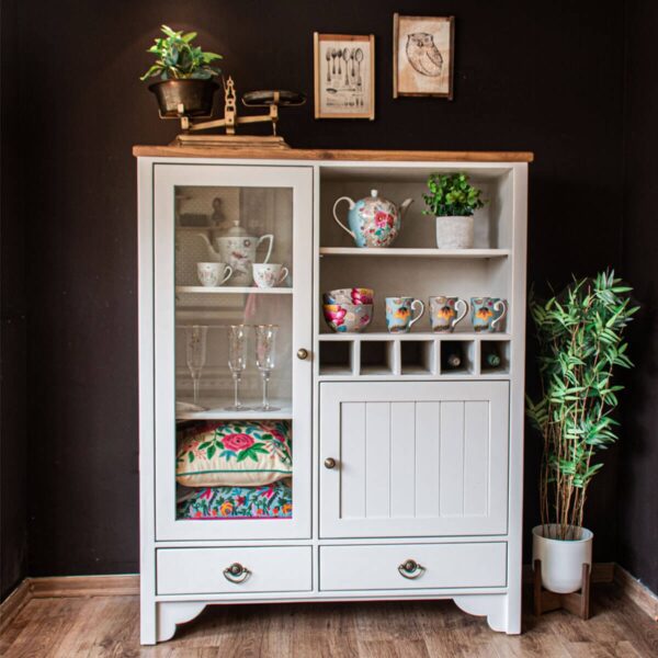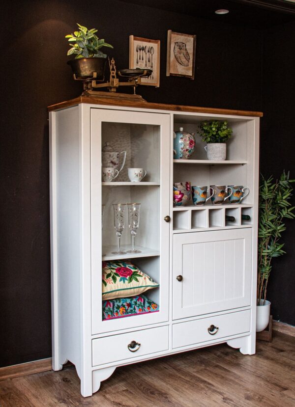 ויטרינה בסגנון כפרי, משלבת אחסון סגור ופתוח. בעלת מקום ייעודי לבקבוקי יין.