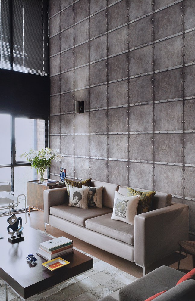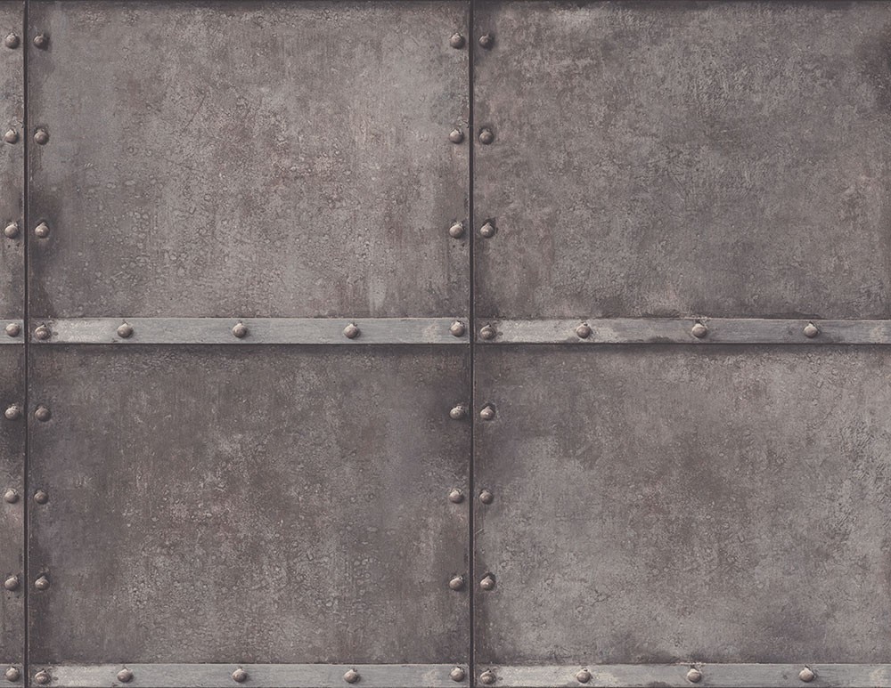 טפט במראה קיר בטון חשוף מוחלק עם סטריפים וניטים של ברזל.