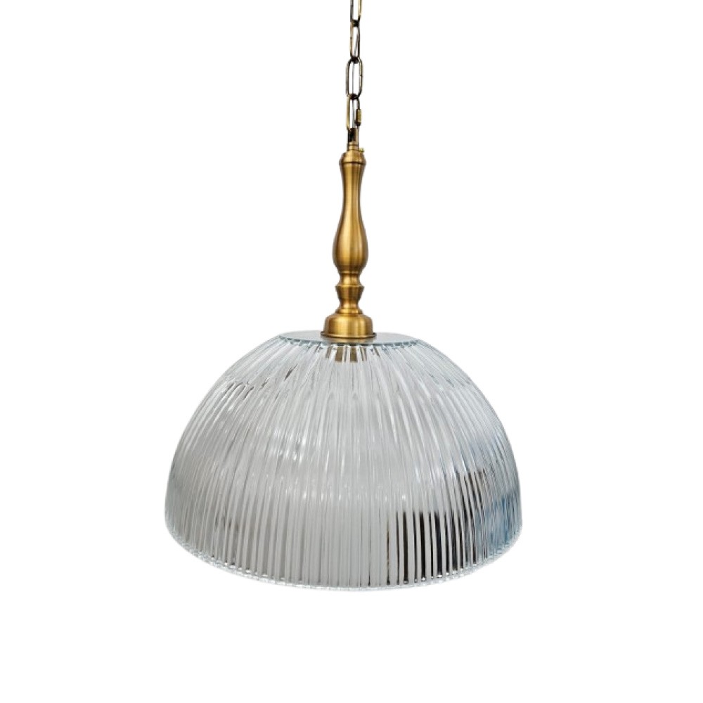 מנורת זכוכית עם פסים עדינים המגיעה עם חובק מתכת ותלויה על שרשרת