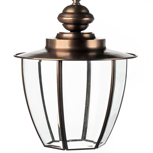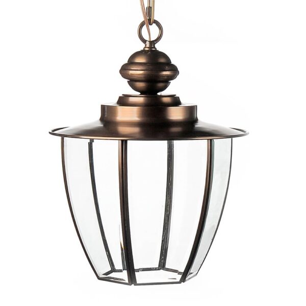 גוף תאורה תלוי עשוי זכוכית בשילוב פסי נחושת
