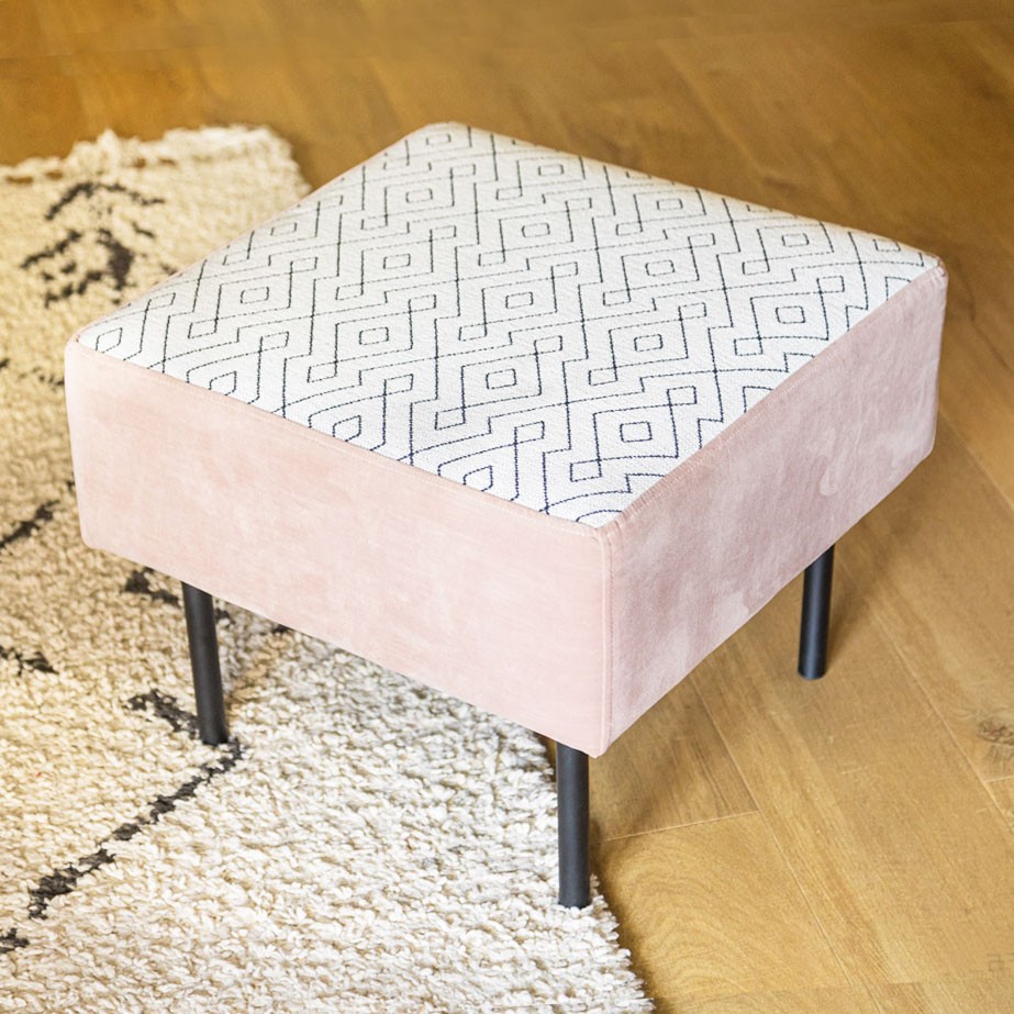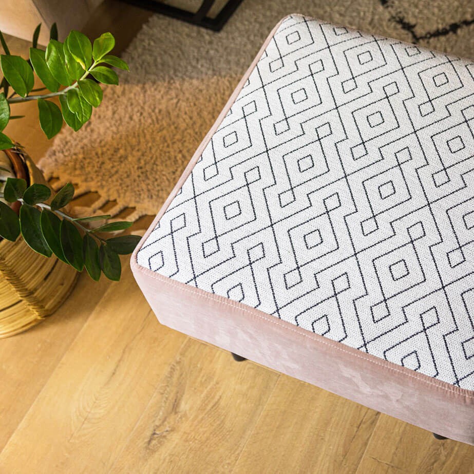 הדום מרובע מרופד בד בדוגמה גאומטרית בחלקו העליון ובבד בטקסטורה עדינה בחלקו התחתון