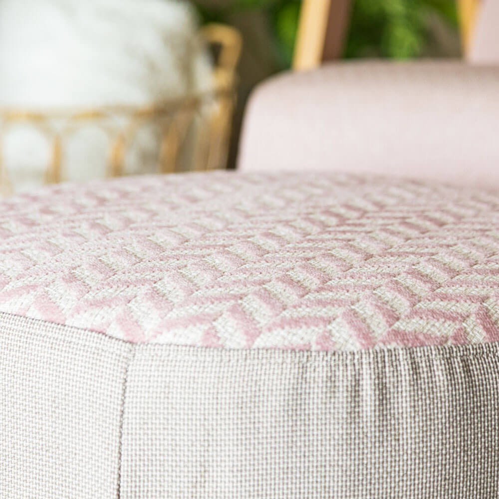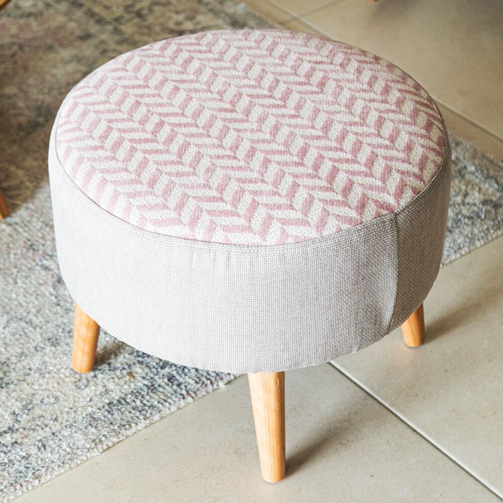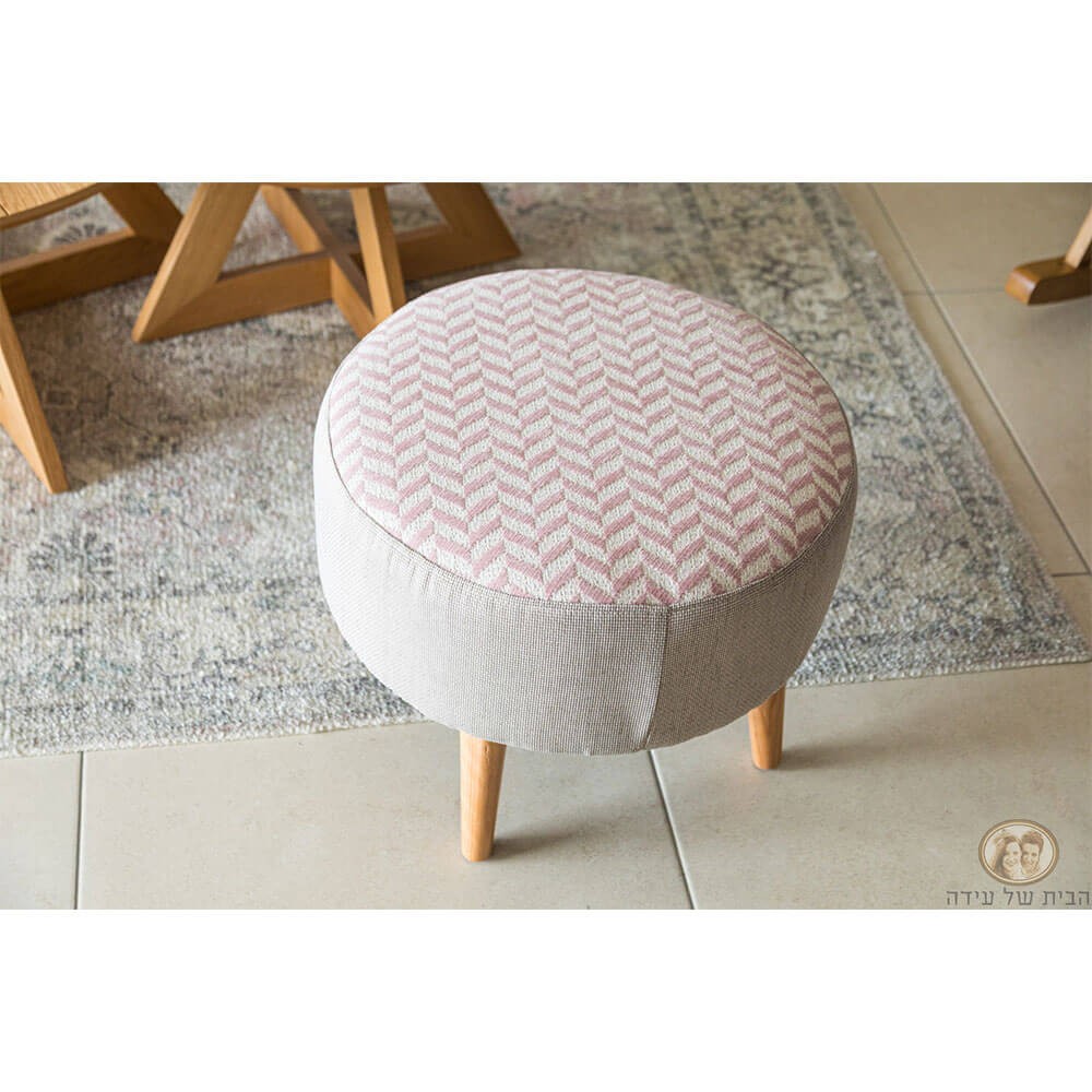 הדום עגול מרופד בד בדוגמה גאומטרית בחלקו העליון ובבד בטקסטורה עדינה בחלקו התחתון