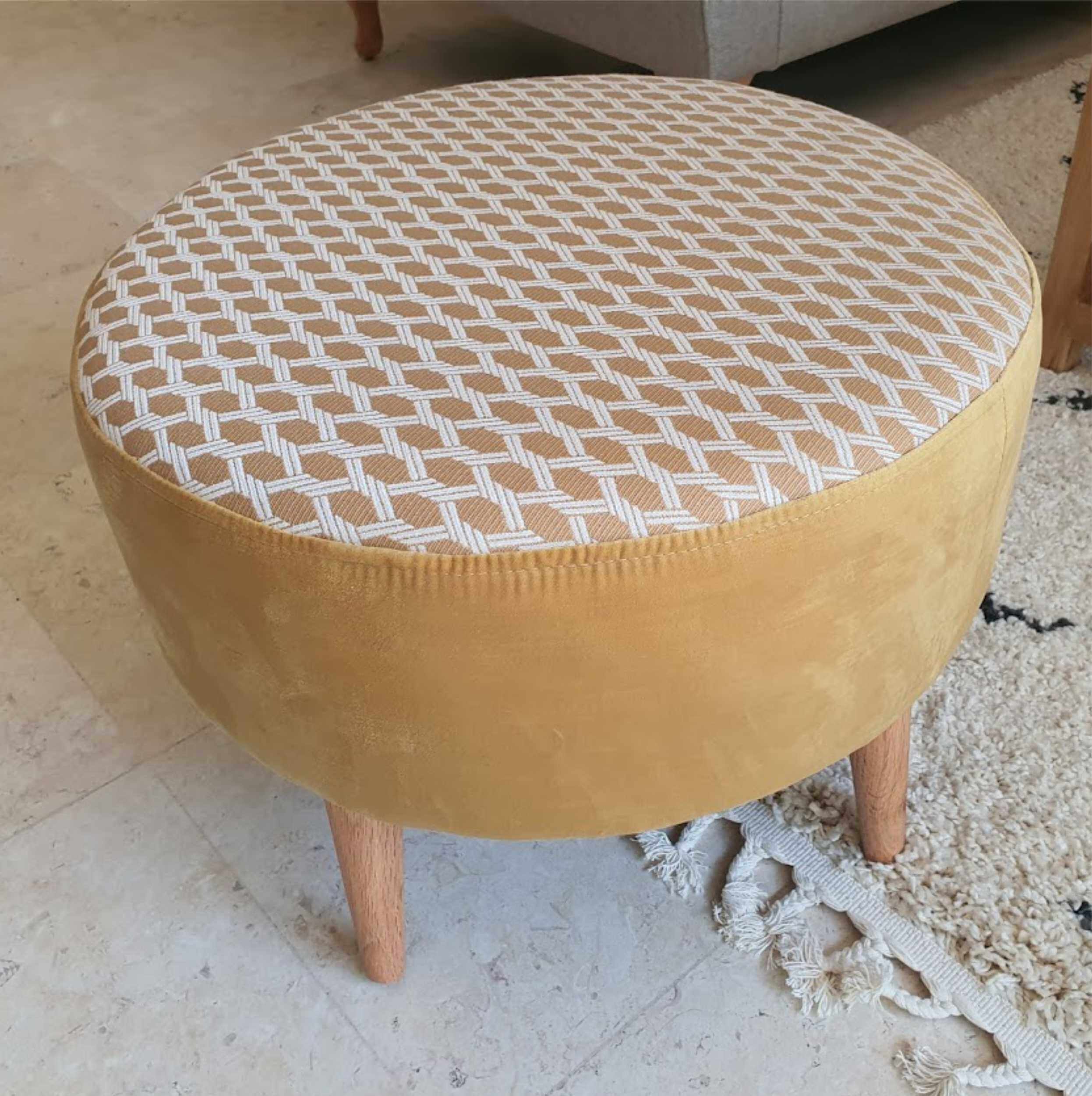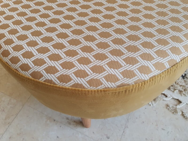 הדום עגול מרופד בד בדוגמה גיאומטרית בחלקו העליון ובד אחיד צהוב בחלקו התחתון