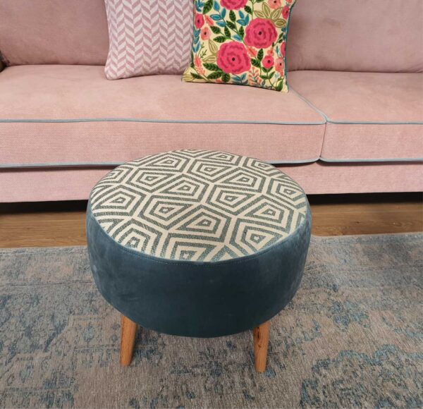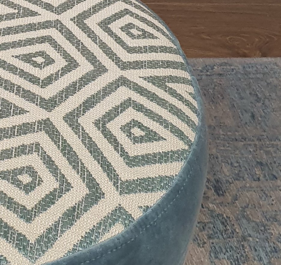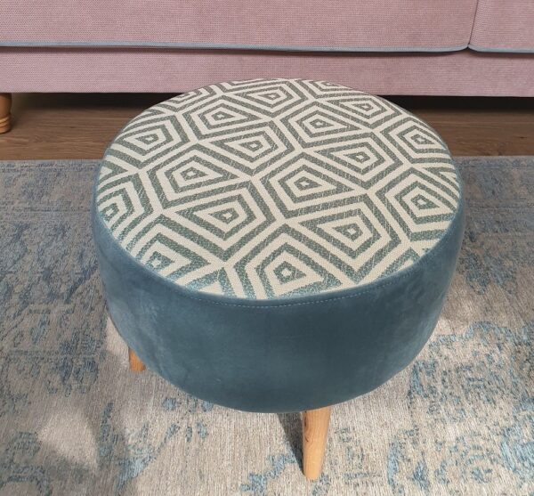הדום עגול מרופד בד בדוגמה גיאומטרית בחלקו העליון ובד אחיד בחלקו התחתון