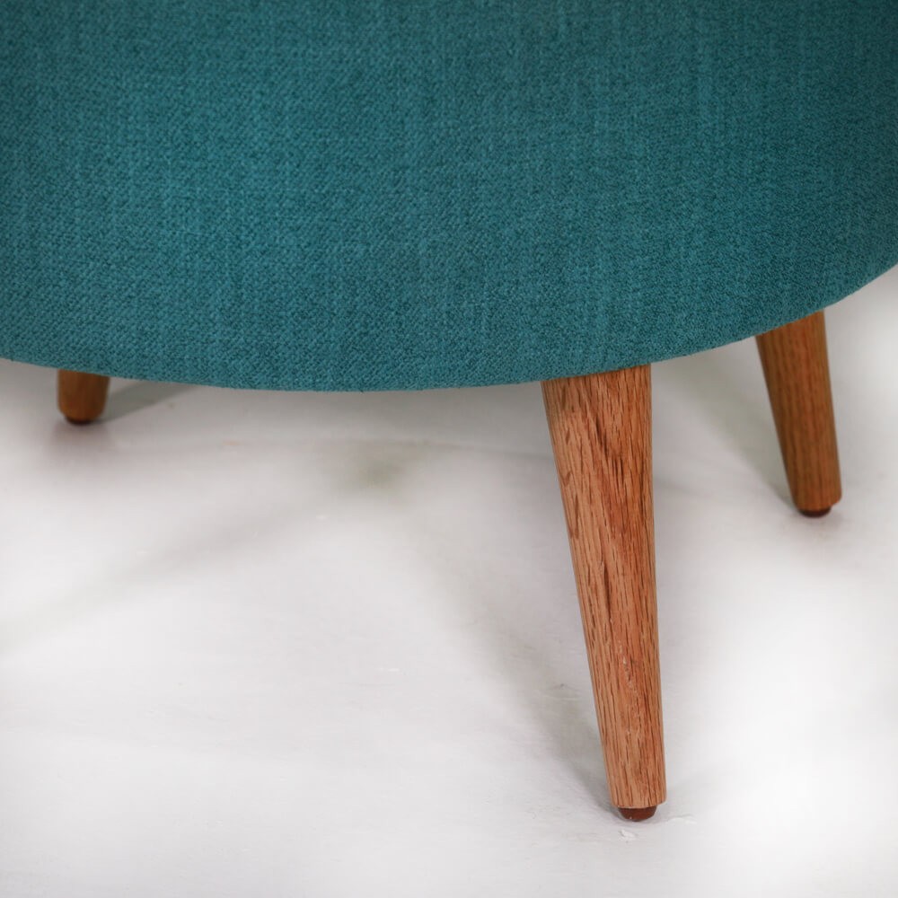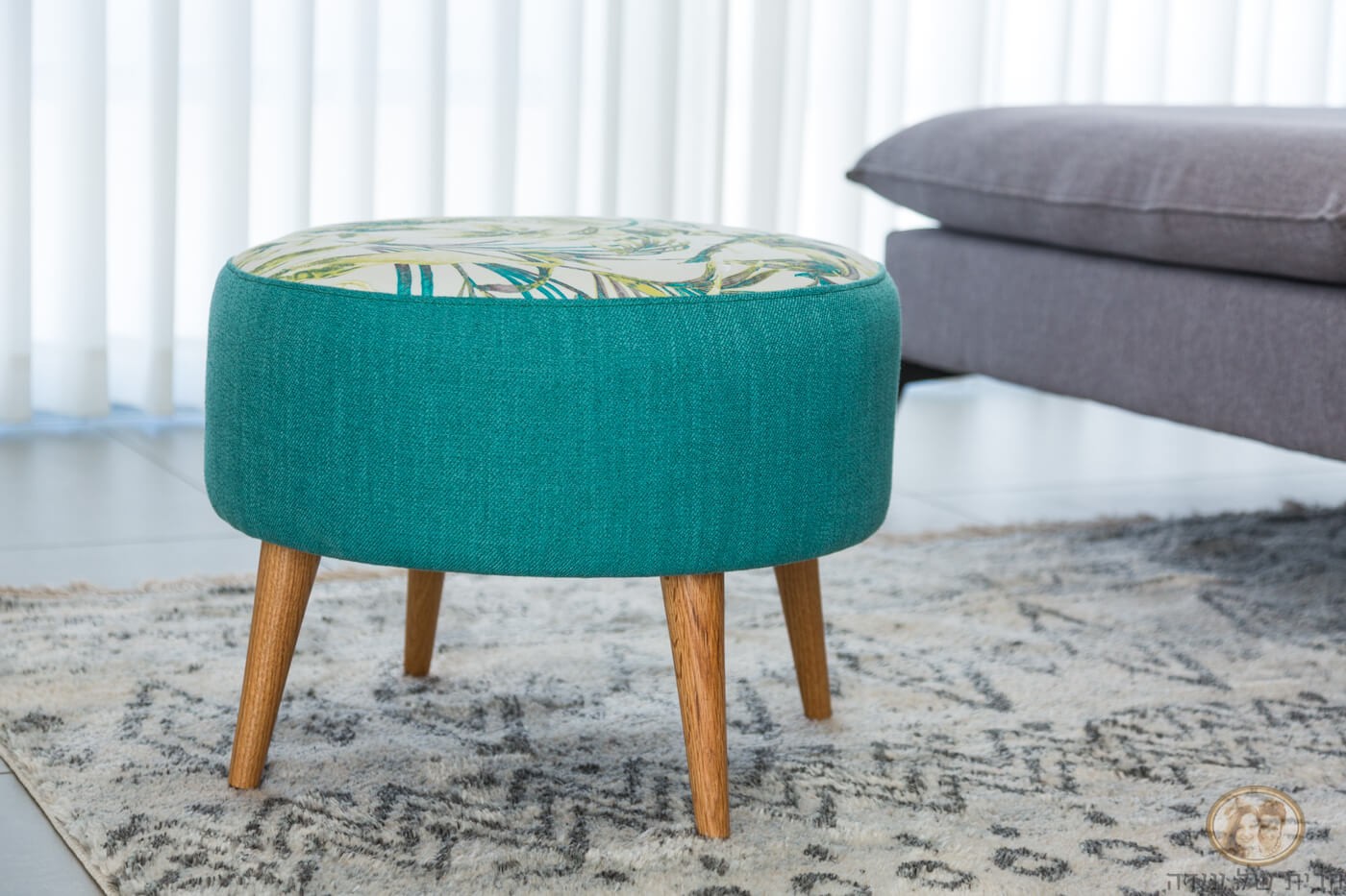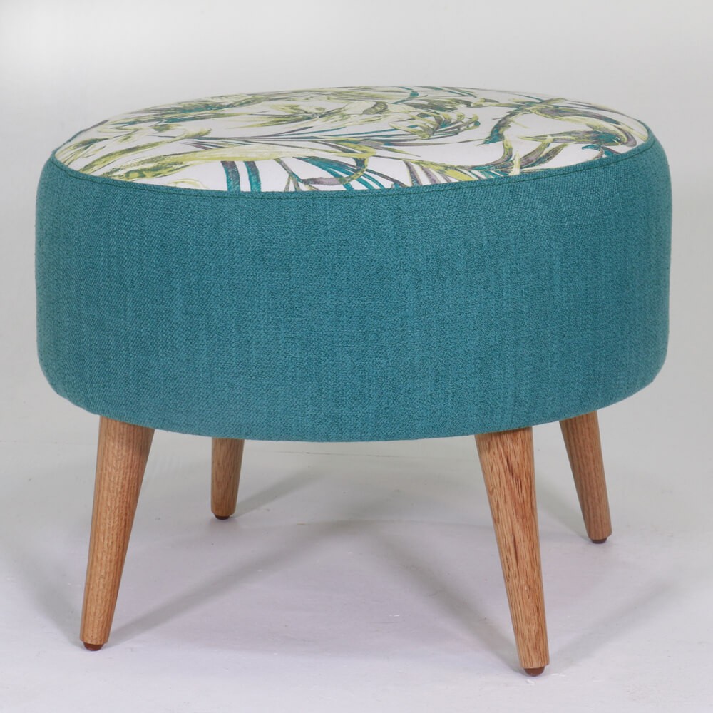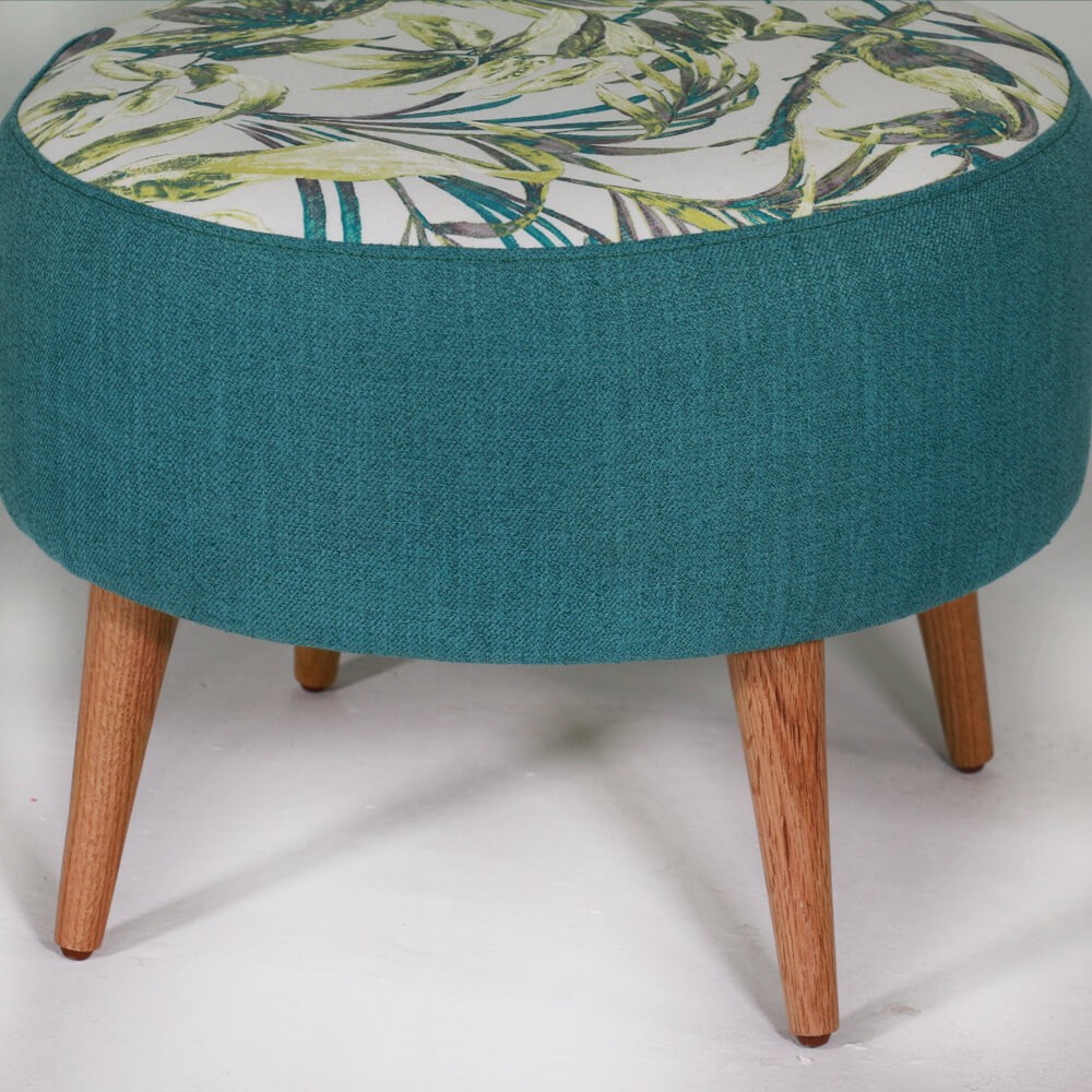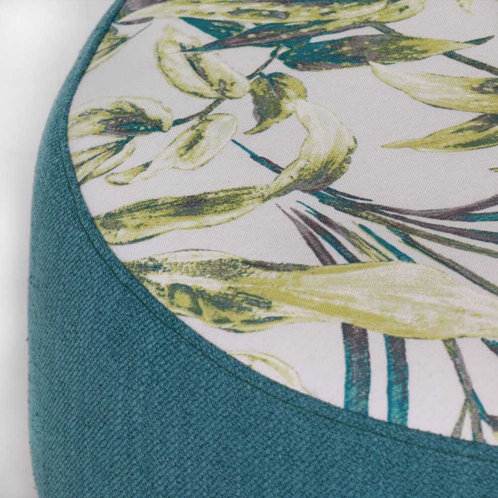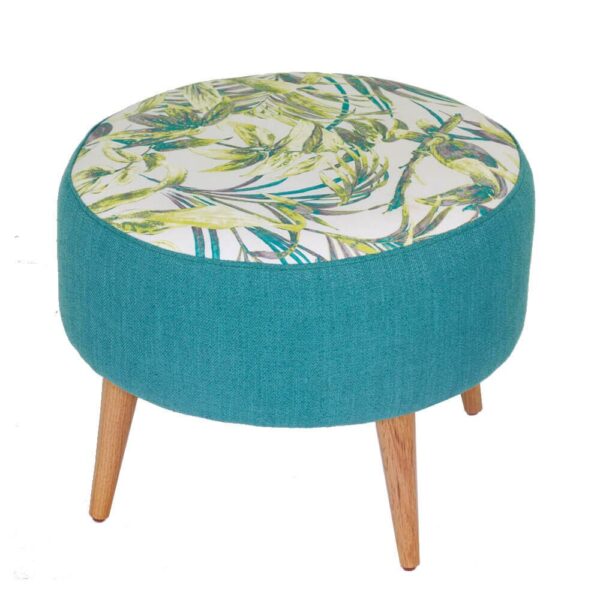הדום עגול מרופד בד בגוון טורקיז בבסיסו ובד עם הדפס טרופי בגווני טורקיז בחלקו העליון