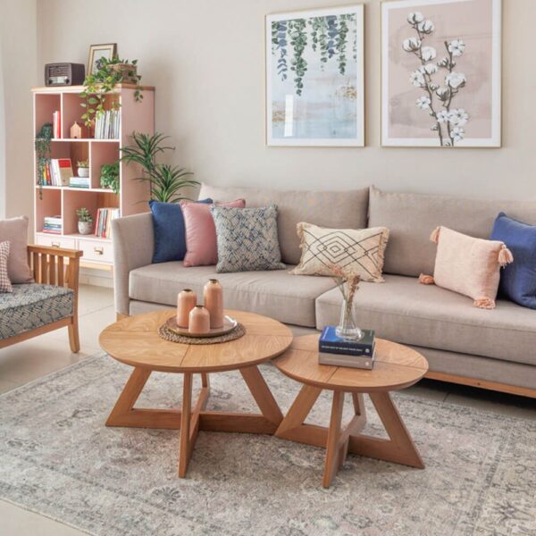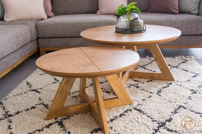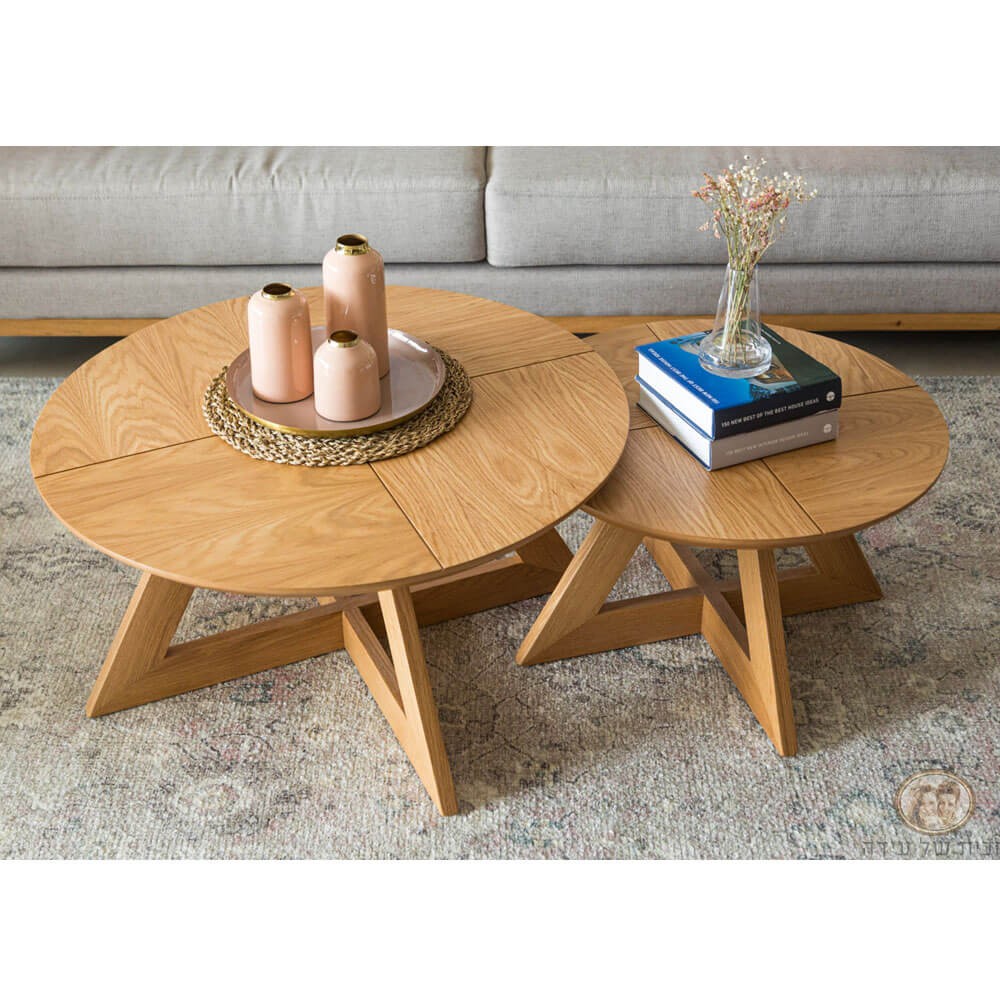 זוג שולחנות קפה עגולים, הרגלים מעץ אלון מלא, הפלטה העליונה מפורניר אלון.