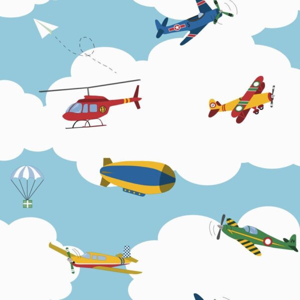 טפט עננים עם מטוסים ומסוקים בגווני תכלת, לבן, צהוב, ירוק, כתום ואדום