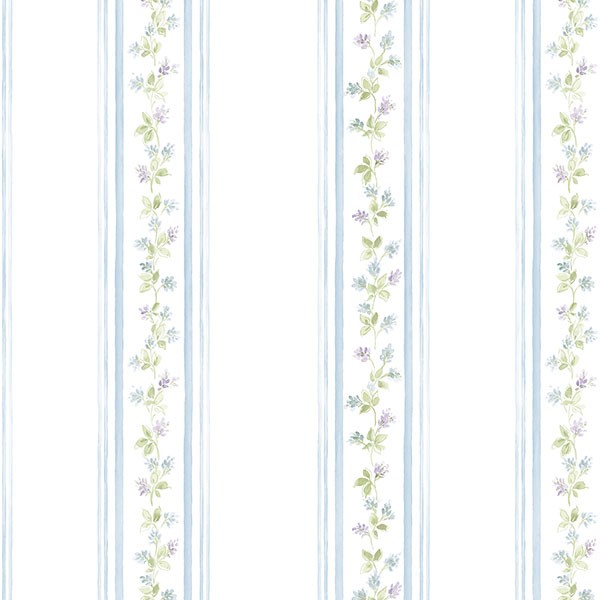 טפט פסים משולב עלים ופרחים בגווני תכלת, ירוק וסגול על רקע לבן