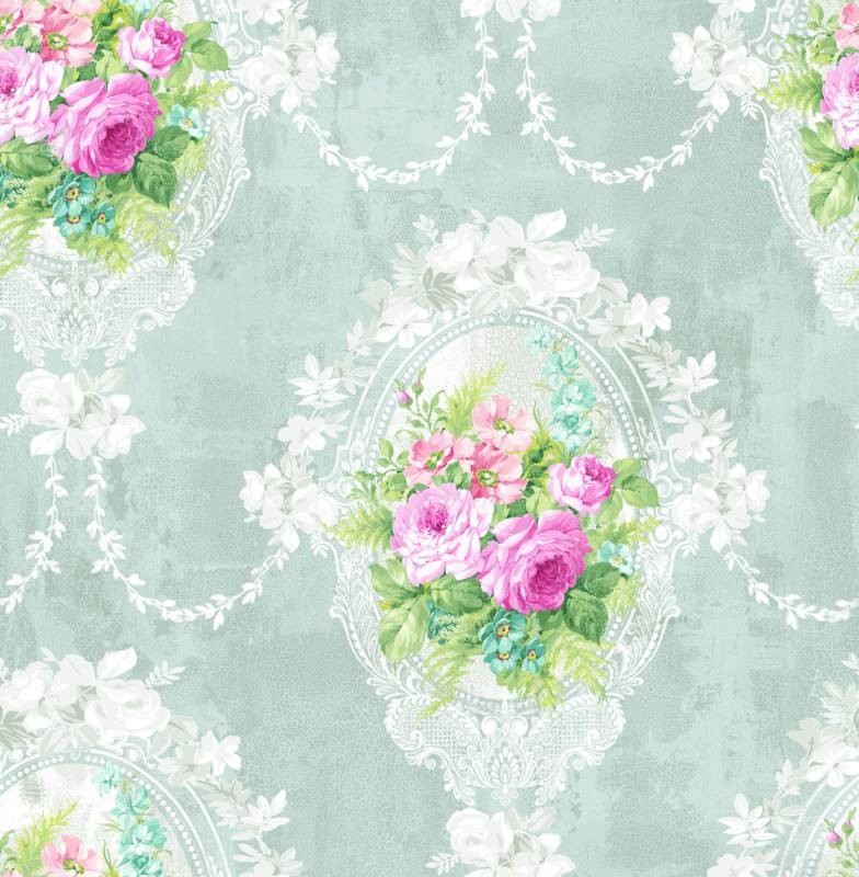 טפט פרחים בגווני אפור, ורוד וירוק
