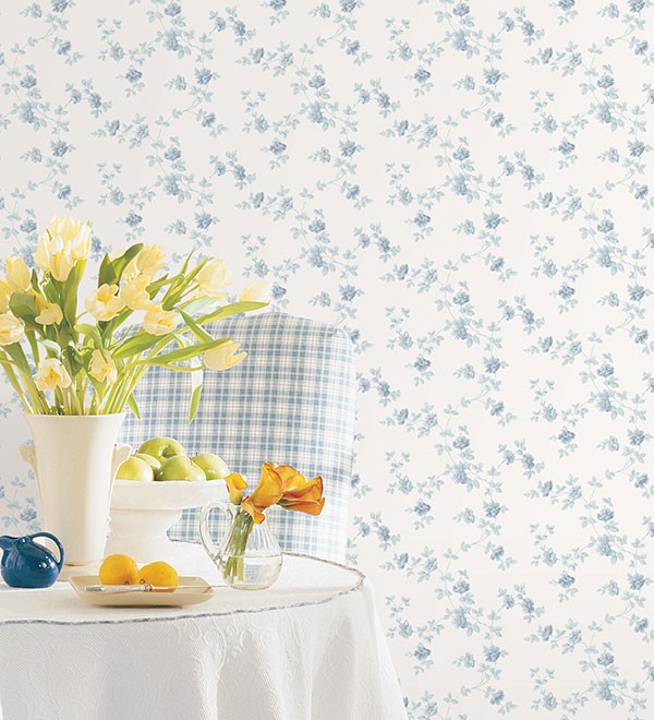 טפט פרחים עדיו בגווני כחול על רקע לבן