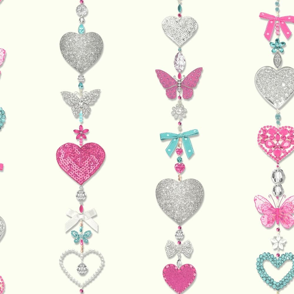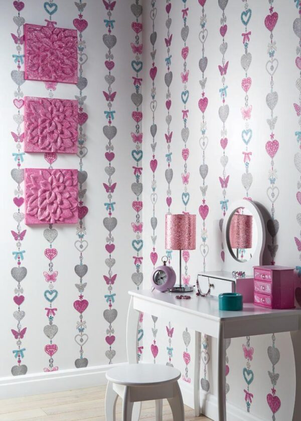 טפט פרפרים ולבבות בגווני תכלת, ורוד ואפור