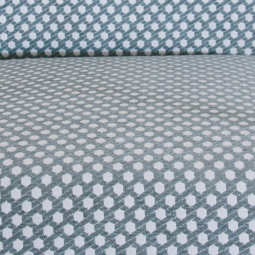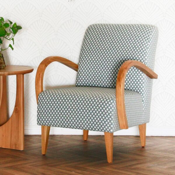 כורסת פרידה מעוצבת קטנה ושובבה מרופדת בבד בדוגמה גאומטרית בגוון טורקיז מעושן