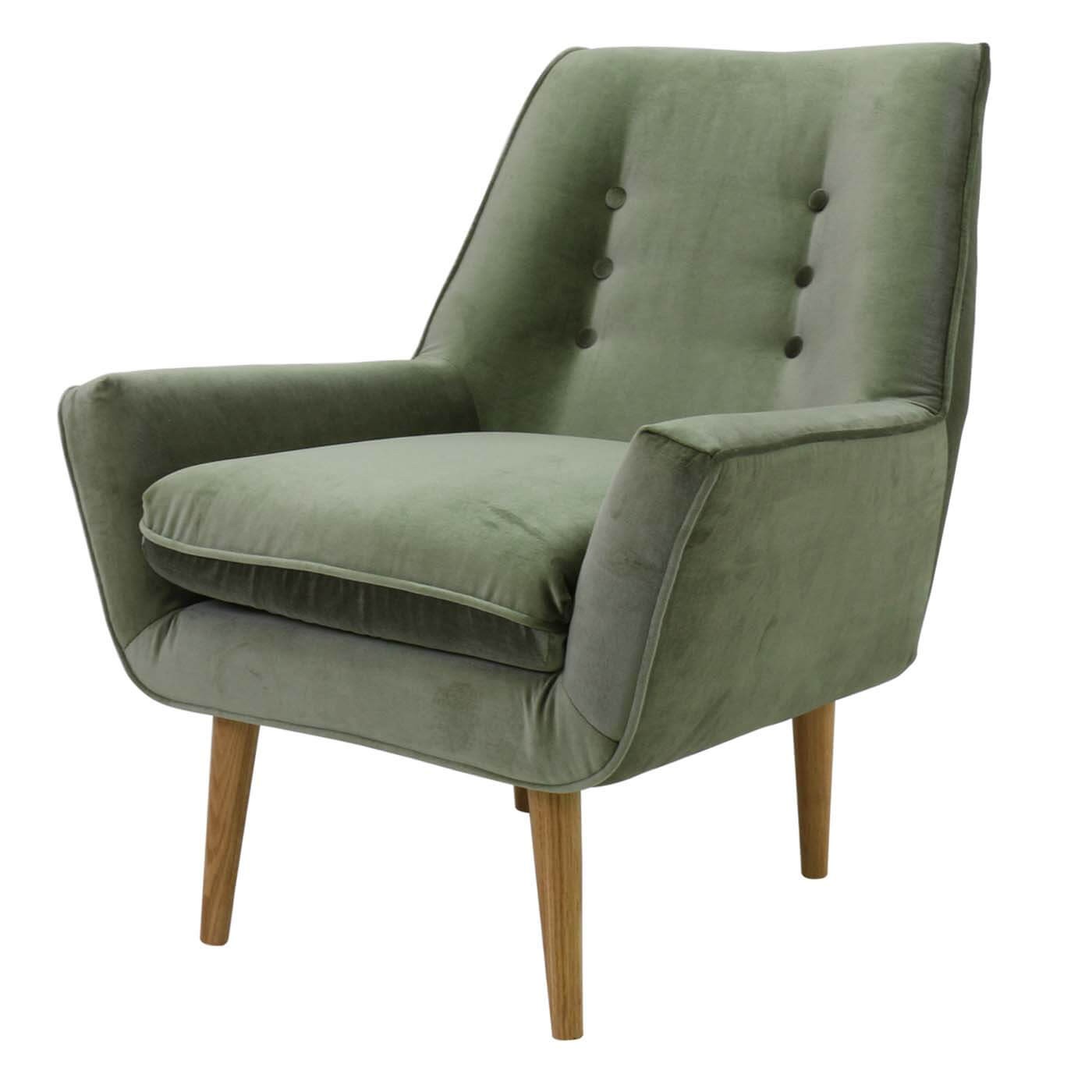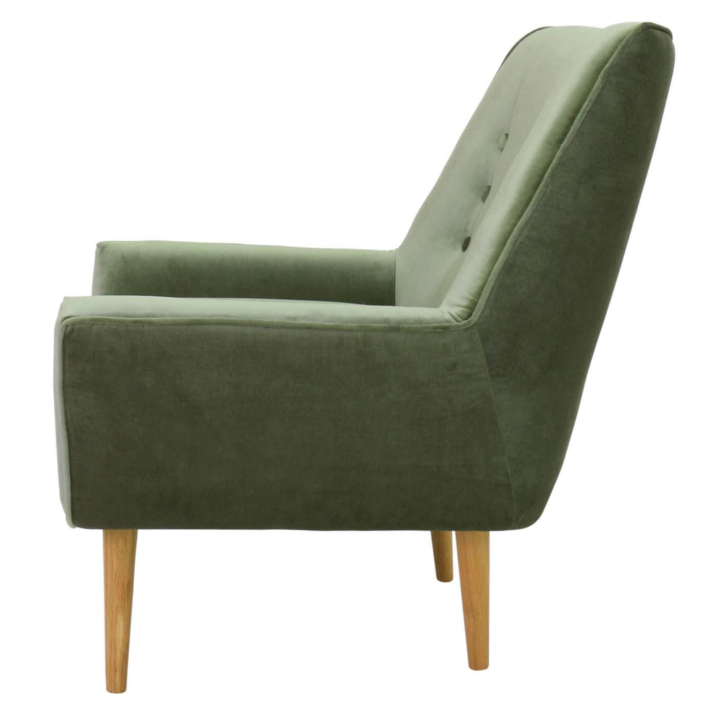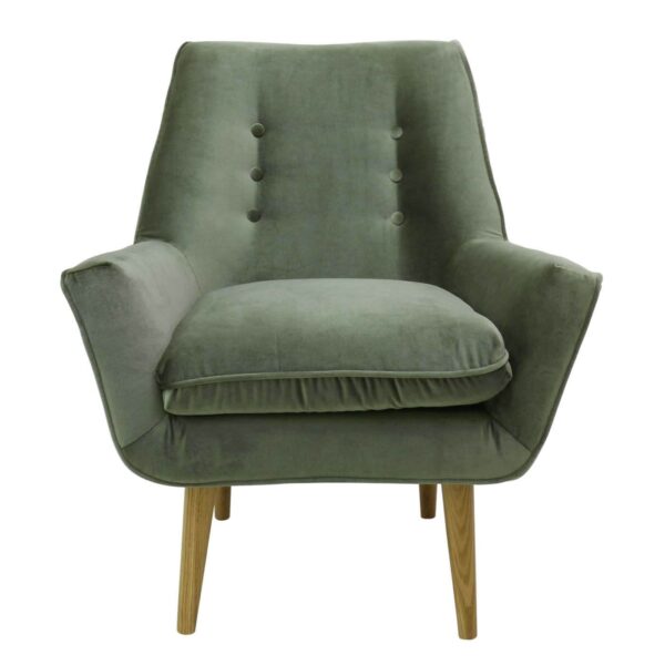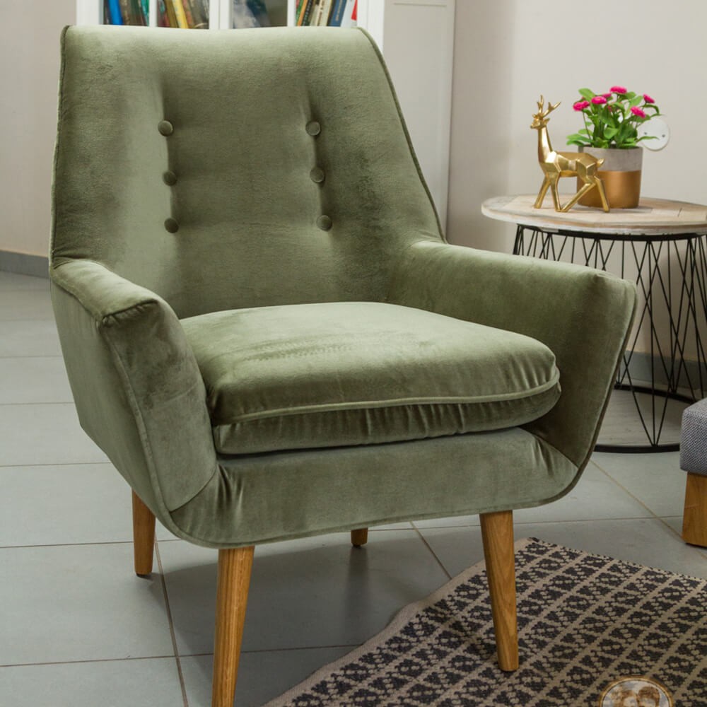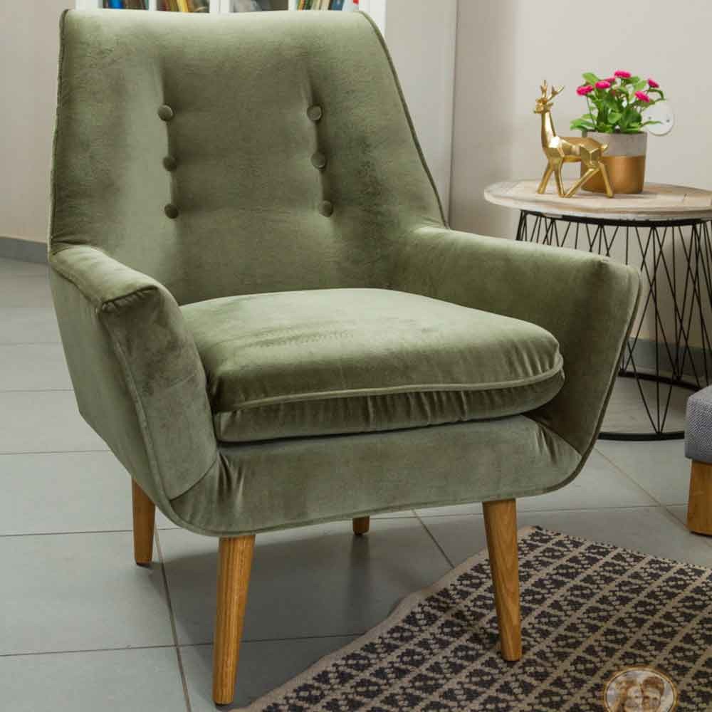 כורסה מעוצבת גניה בעיצוב רטרו ובריפוד קטיפה בצבע ירוק מעושן