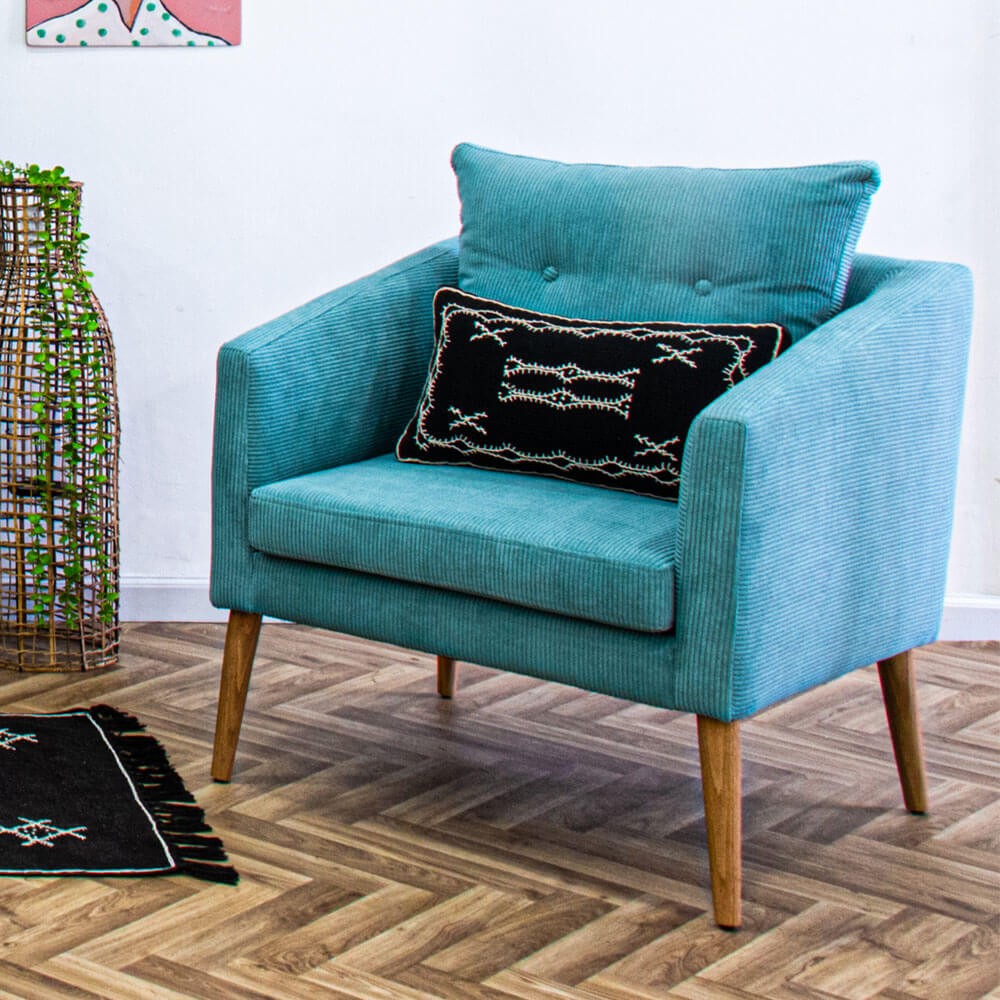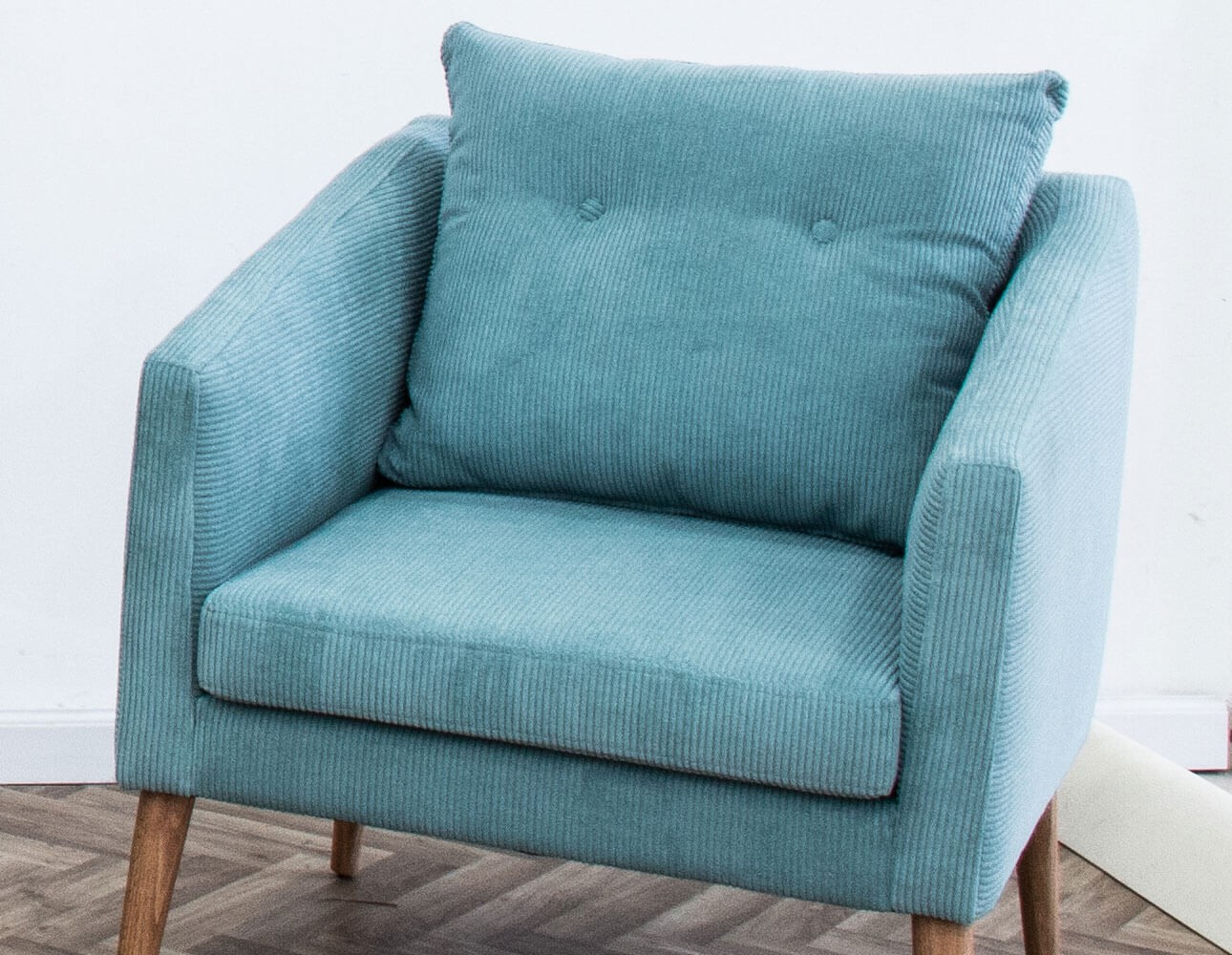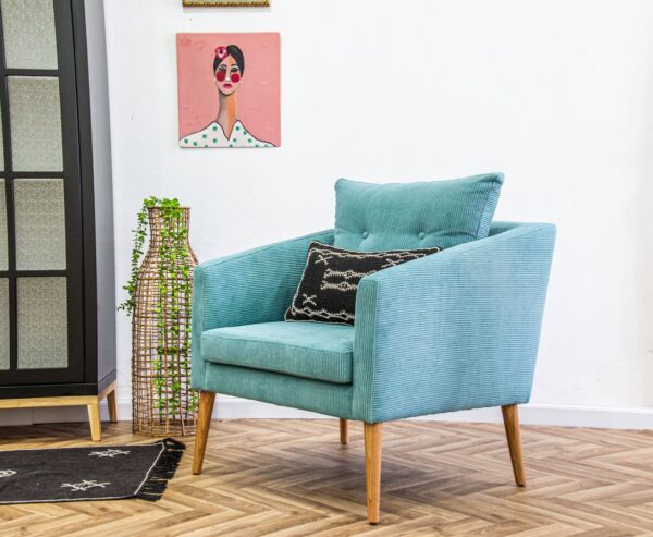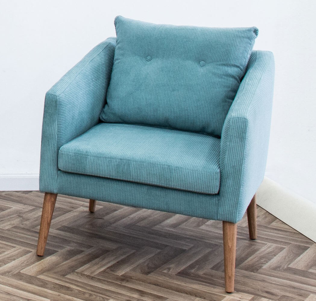 כורסת הילי, בעלת קווים נקים, משענות יד מרופדות עם נטיה אלכסונית קלה ורגלי עץ אלון