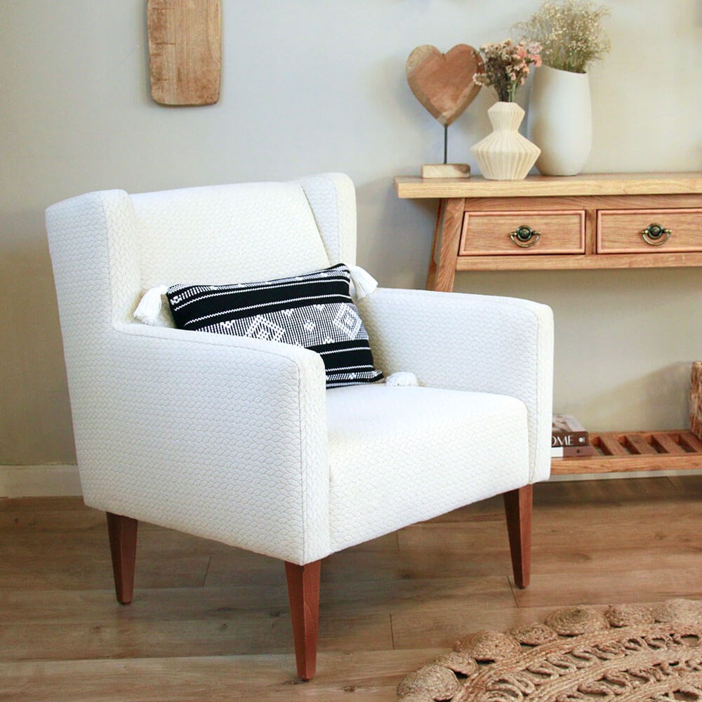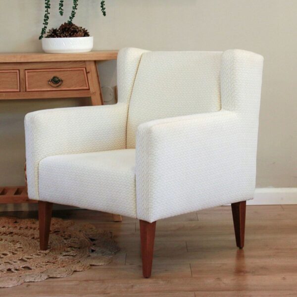 כורסה מעוצבת סטלה, מרופדת בד איכותי, בעלת רגלי עץ אגוז