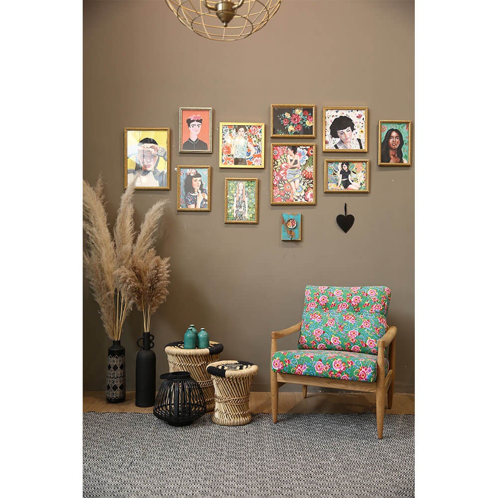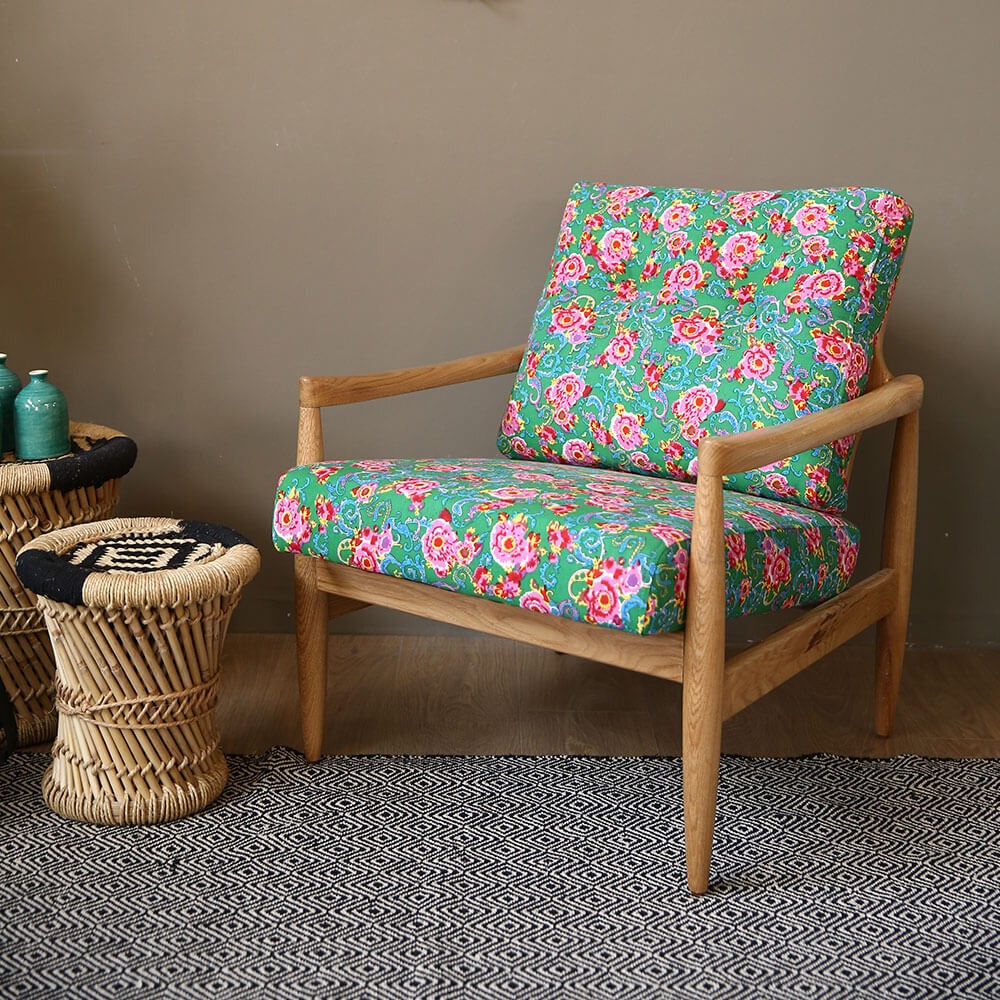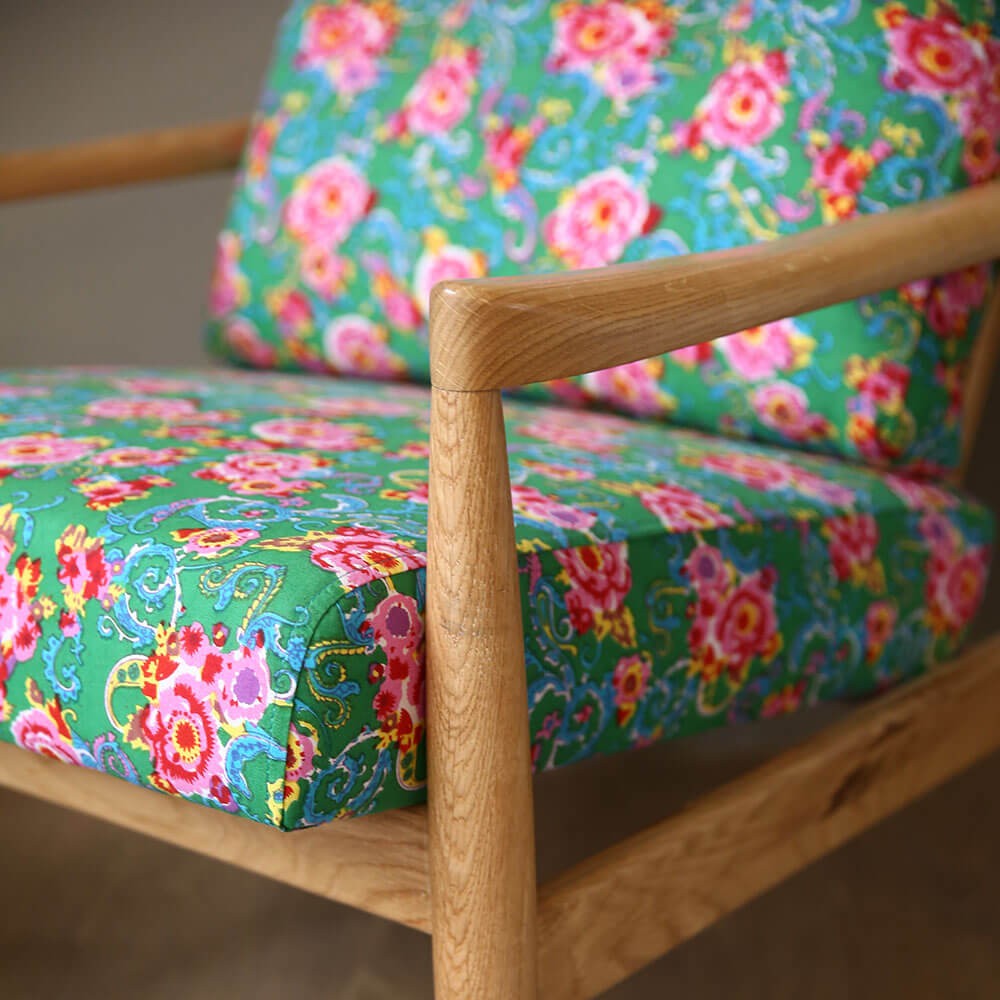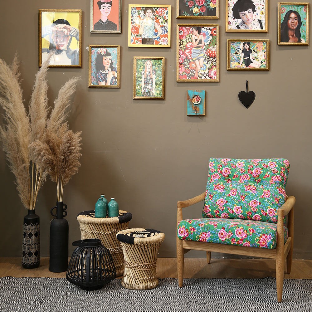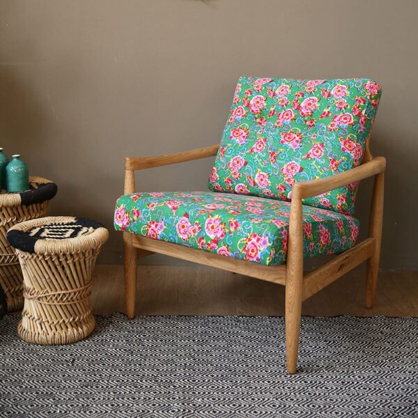 כורסה מעוצבת קים, מרופדת בד בדוגמת פרחים, בעלת משענת בעיצוב ייחודי