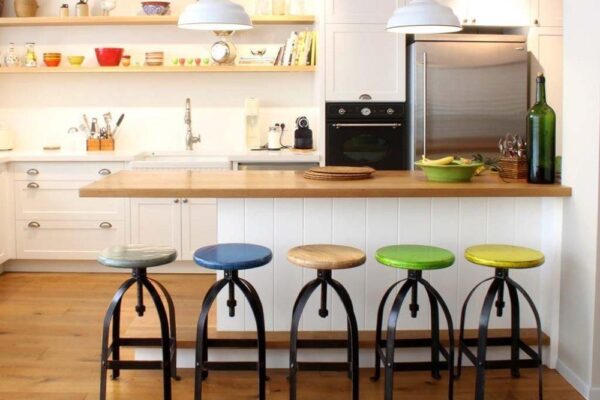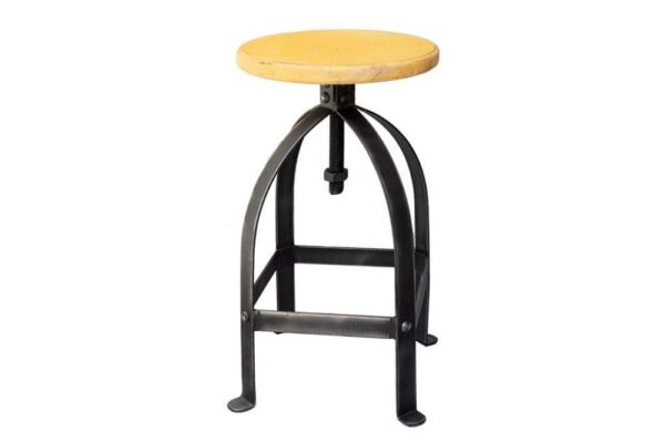 כסא בר ברזל צהוב חרדל עם מושב עגול מתכוונן לגובה בצורת הברגה. הכסאות מעוצבים בסגנון תעשייתי מחוספס ומיוצר מברזל יצוק בצבע שחור ומושב עץ עגול הצבוע בגוונים מרהיבים עם אפקט מיוחד למראה כפרי. הכיסא מתכוונן עד לגובה 85 ס"מ לנוחיות המשתמש. רהיט מושלם לעיצוב הדלפק או הבר במטבח