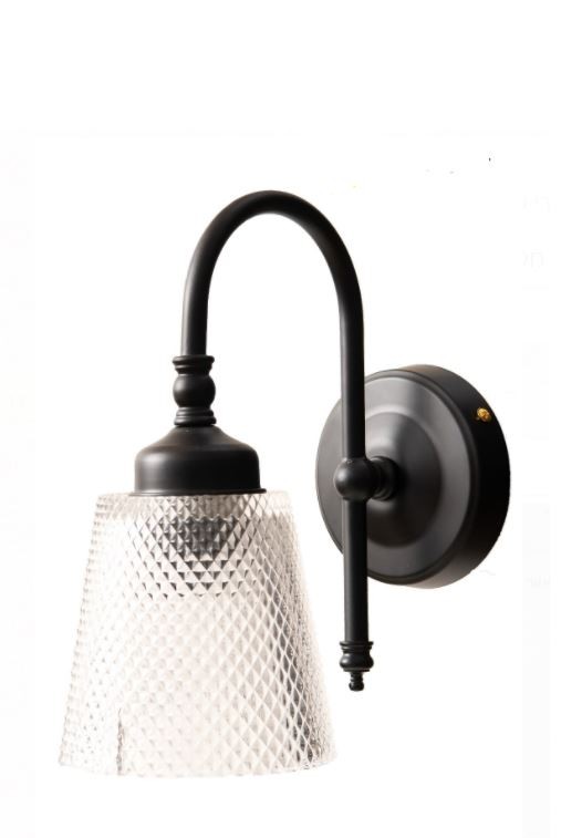 לורן מנורה צמודת קיר, בעלת זרוע קשת בצבע שחור, ועליה כוס זכוכית קלאסית