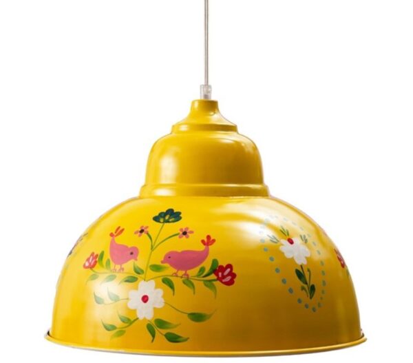 מנורת לייסי, עשויה מתכת צבועה בצהוב ועליה איורים צבעוניים בצביעת עבודה יד