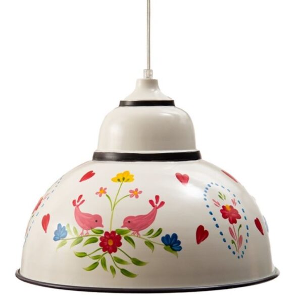מנורת לייסי, עשויה מתכת צבועה בצהוב ועליה איורים צבעוניים בצביעת עבודה יד