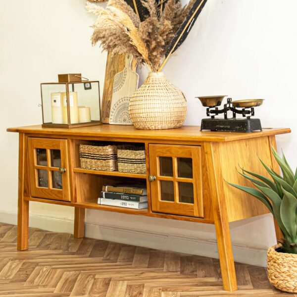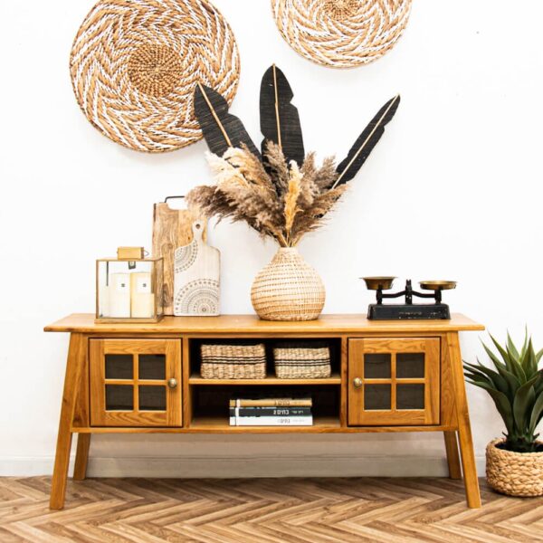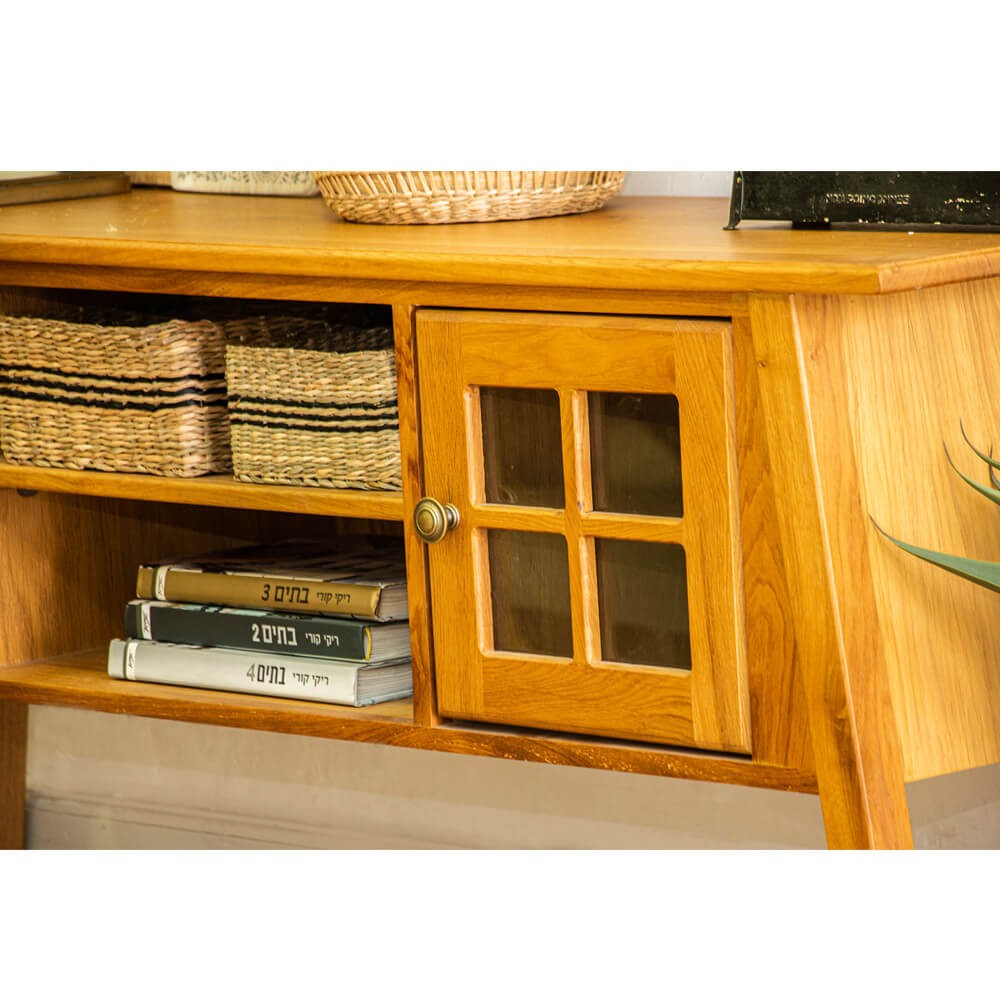 מזנון מעוצב וודי מיוצר מאלון מלא - המשטח העליון מפורניר אלון עם קנט אלון מאסיבי, בעל שני תאי אחסון גדולים ושני תאי אחסון פתוחים, דלתות בשילוב זכוכית וידיות כפתור מוזהבות