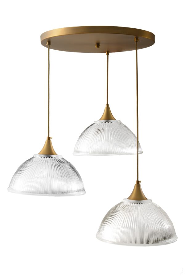 צלחת נחושת בקוטר 45 ס"מ צמודת תקרה ממנה משתלשלים שלושה גופים במראה קלאסי
