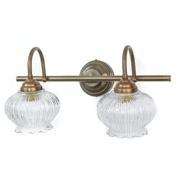 בעלת בסיס עגול בצבע ברונזה עליו מונח מוט וממנו מתפצלים שני אהילי זכוכית יפהפיים