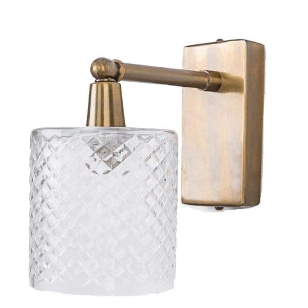 מנורה צמודת קיר, בעלת זרוע ישרה בצבע ברונזה וכוס זכוכית מעוטרת, תפיץ אור עדין ונעים בכל חלל