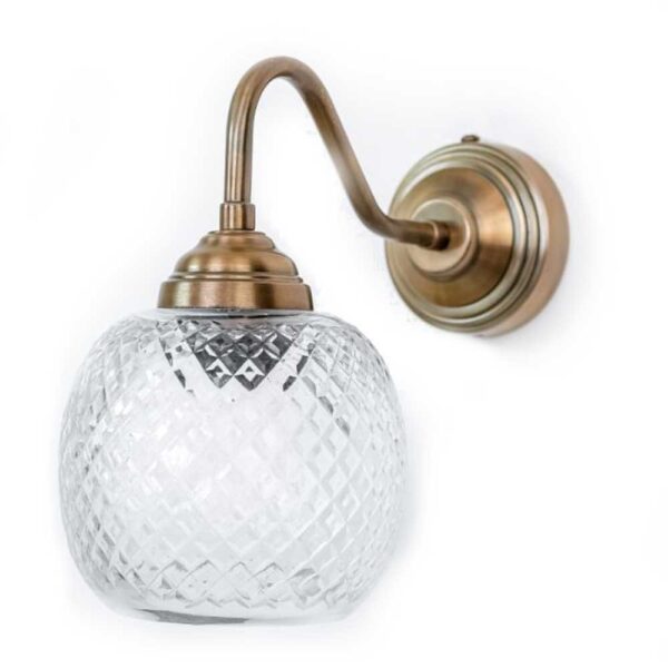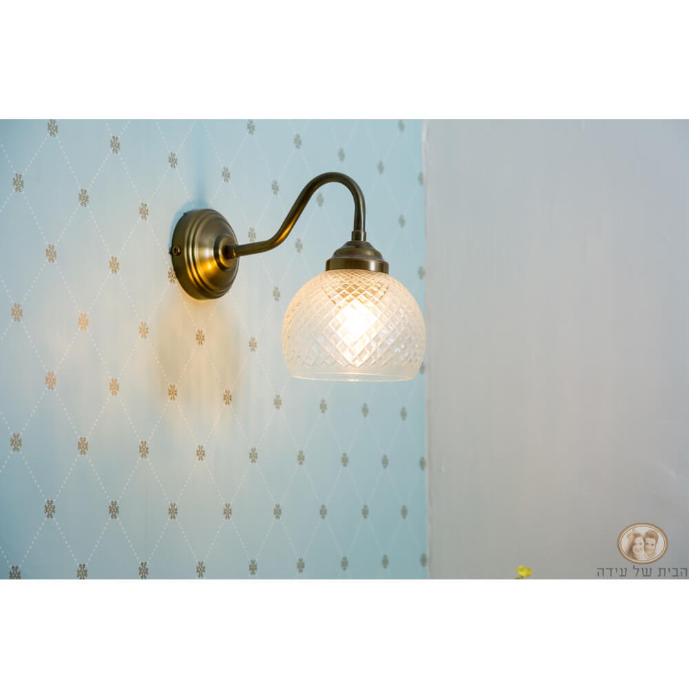 מנורה צמודת קיר, בעלת זרוע מעוגלת בצבע ברונזה וכוס זכוכית מעוטרת, תפיץ אור עדין ונעים בכל חלל