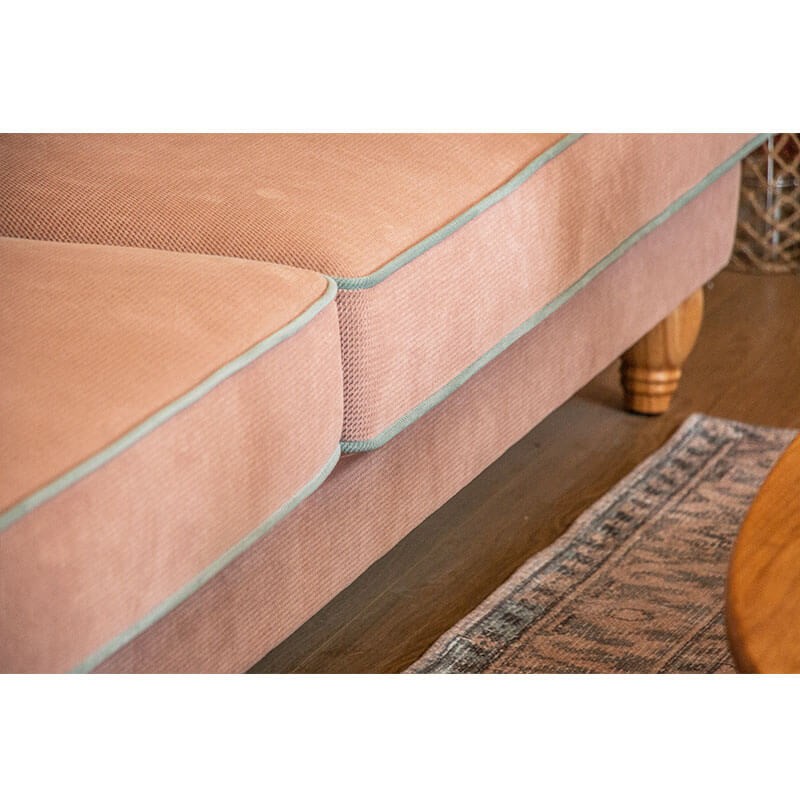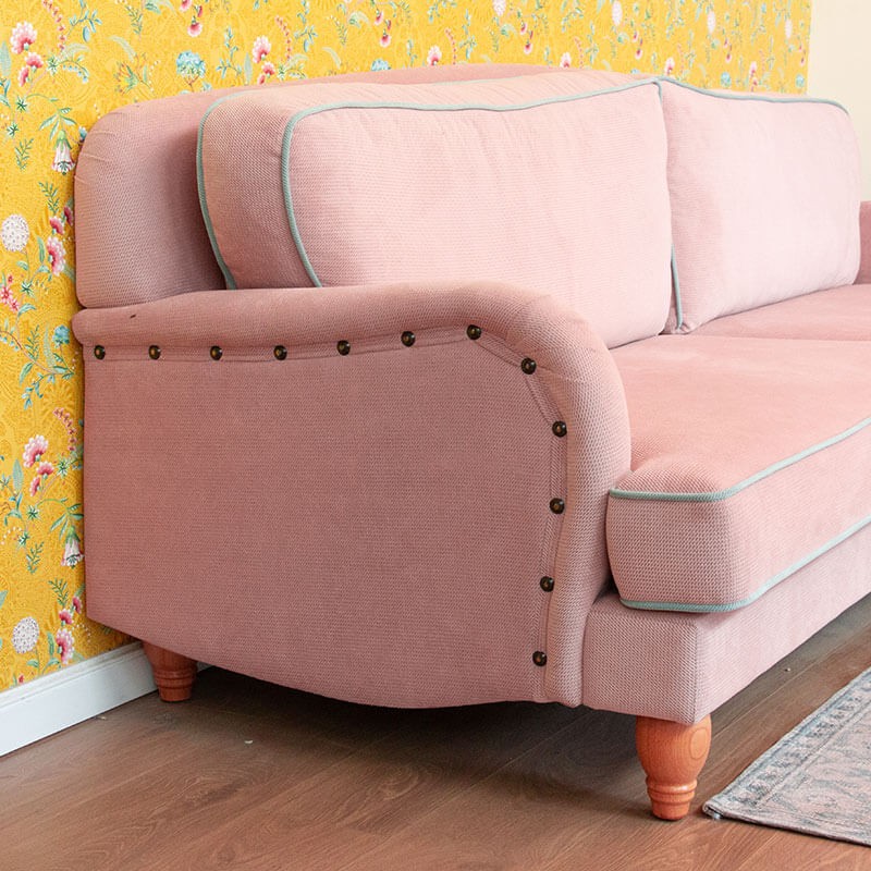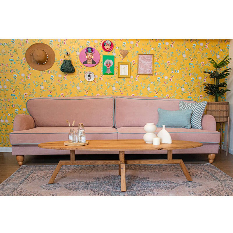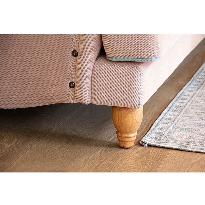 ספה מעוצבת אנג'ליקה - ספה לסלון יפיפייה ומפנקת, בעלת גב מקומר ורגלי עץ אלון מעוגלות.