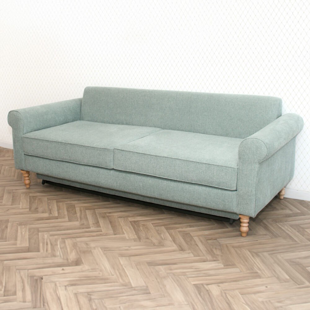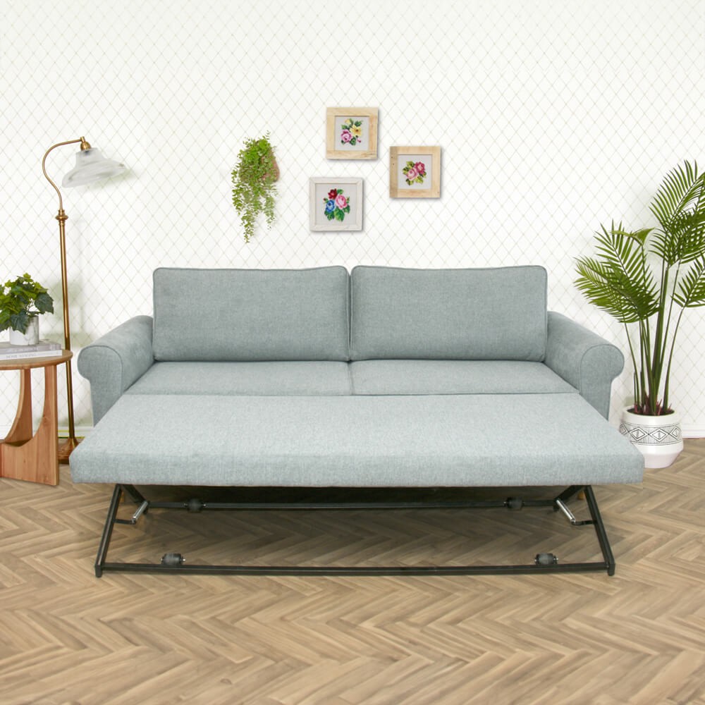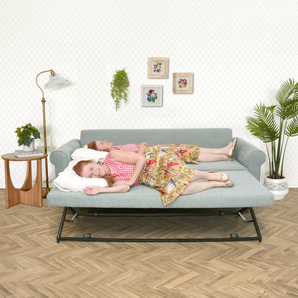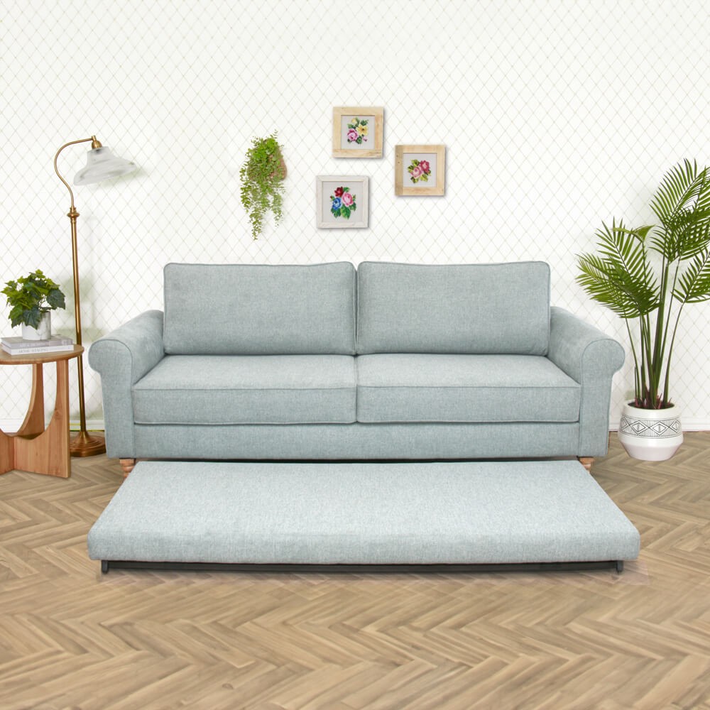 ספת מישל שלנו מעוצבת בקימורים רכים, נפתחת למיטה זוגית
