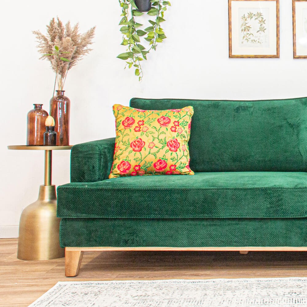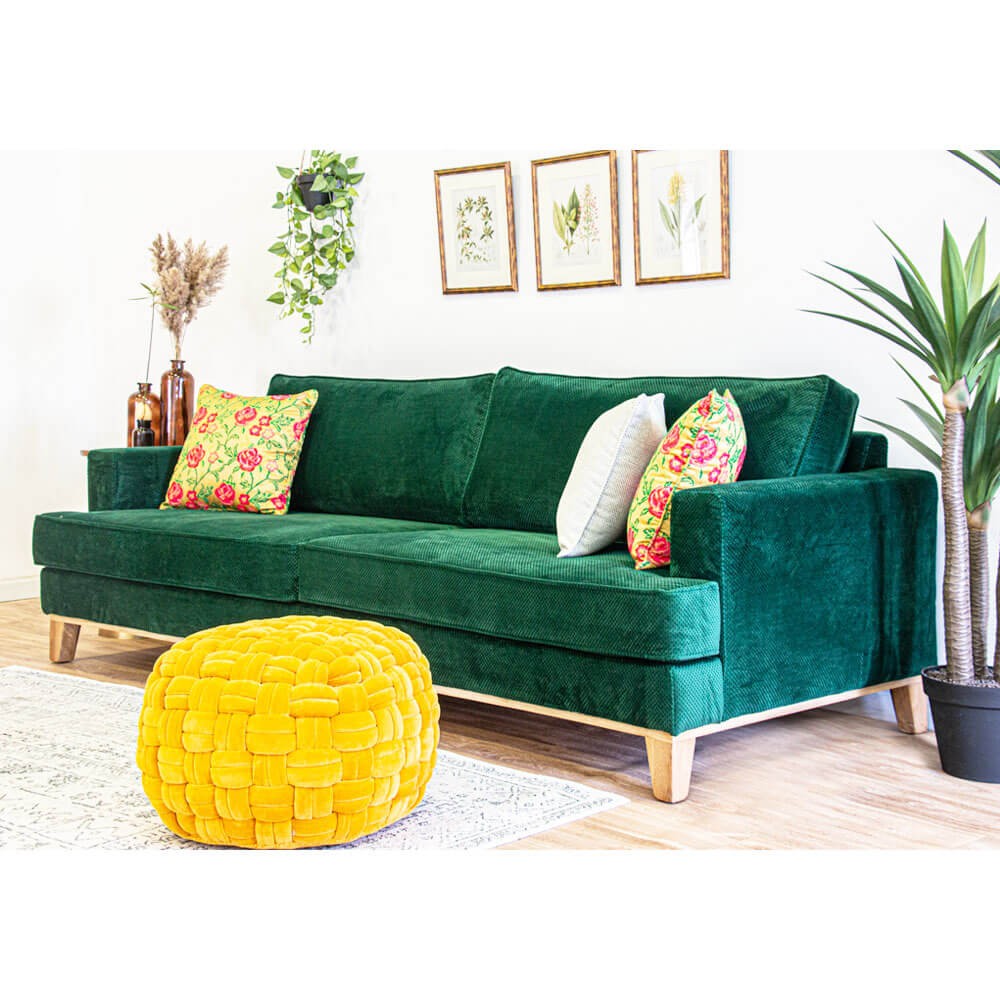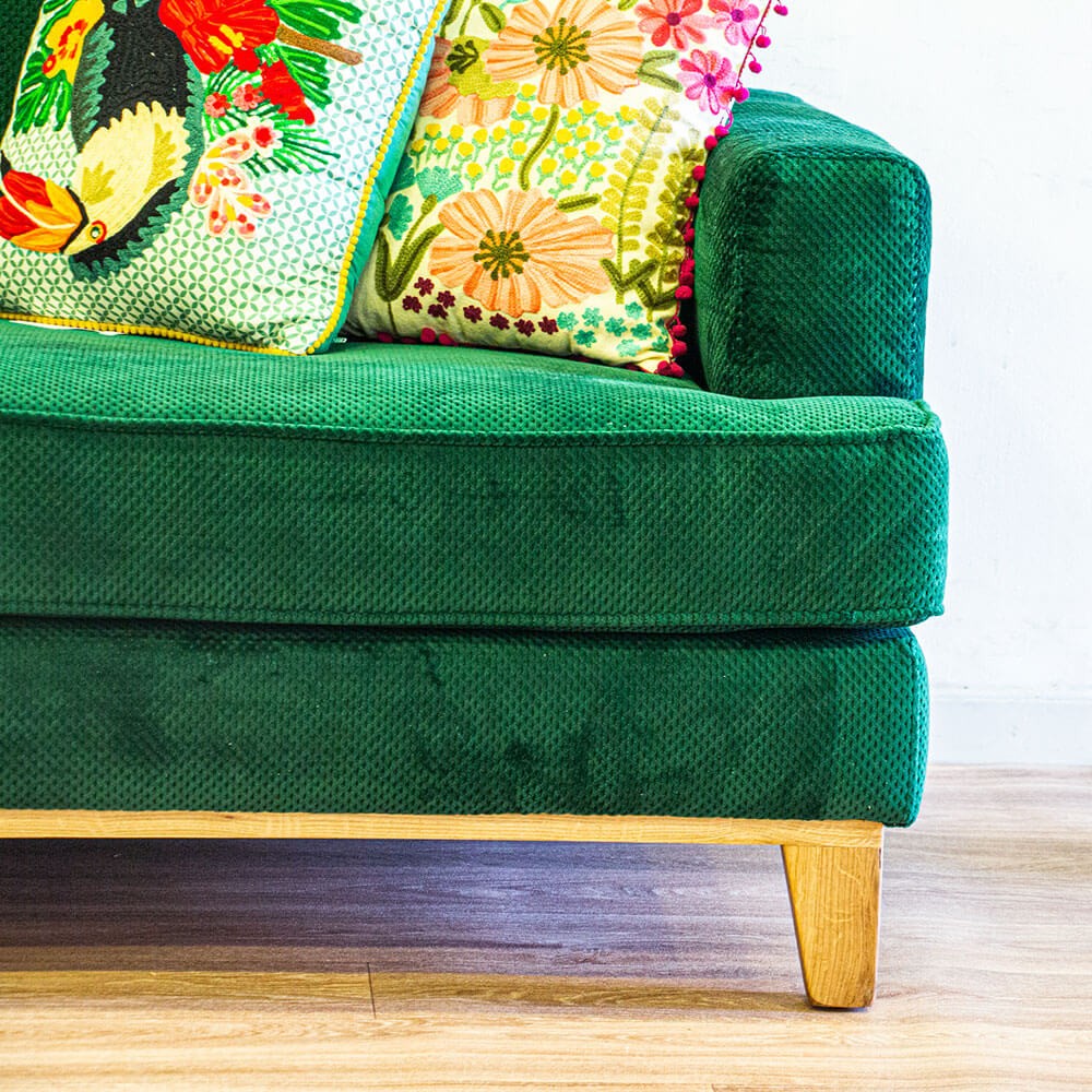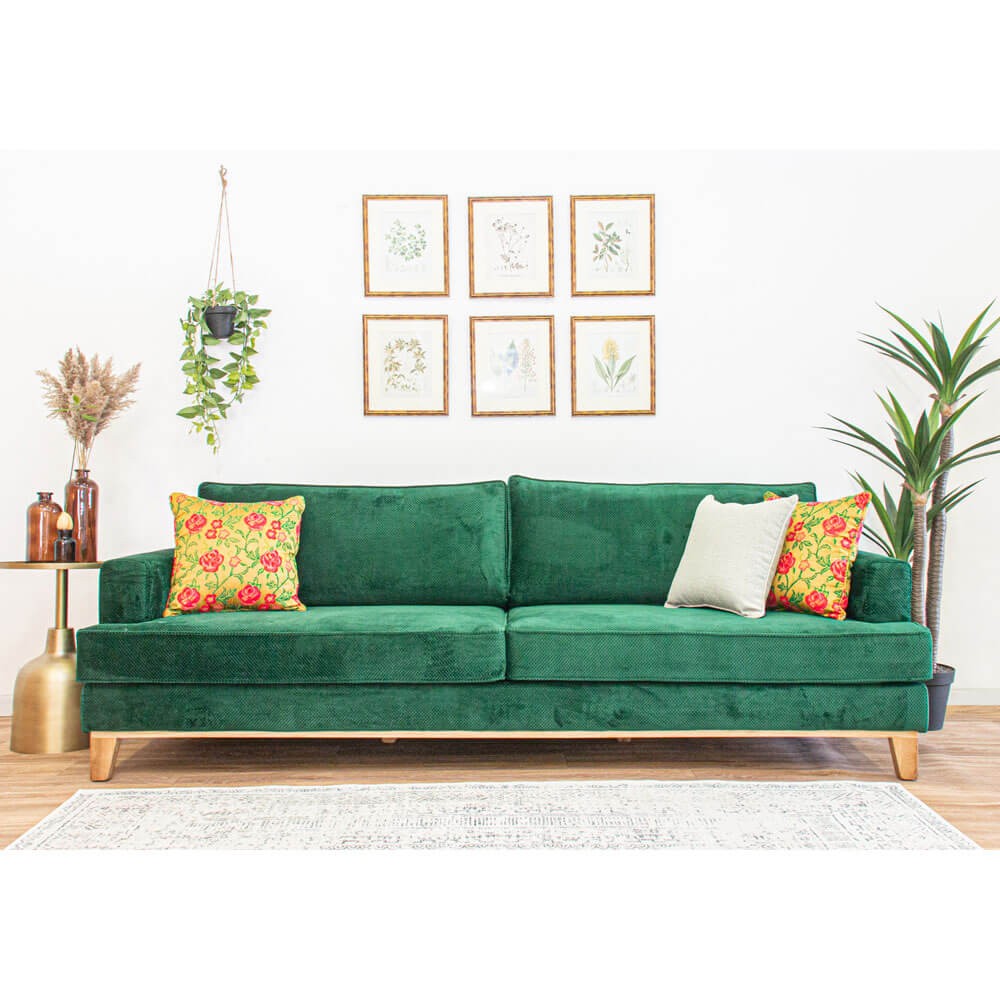 לספה שתי כריות גב מאורכות, משענות צד ורגלי עץ מעוצבות