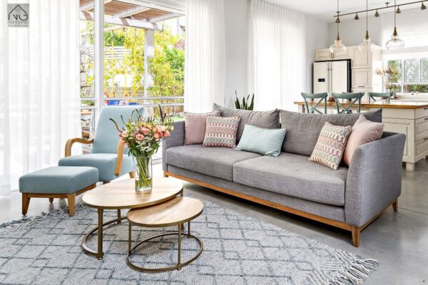 ספה מעוצבת עלמה שלנו. ספה לסלון צעירה ואופנתית. בעלת 2 כריות גב מאורכות ורגלי עץ אלון מעודנות
