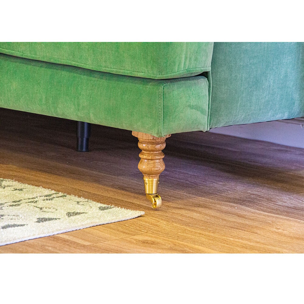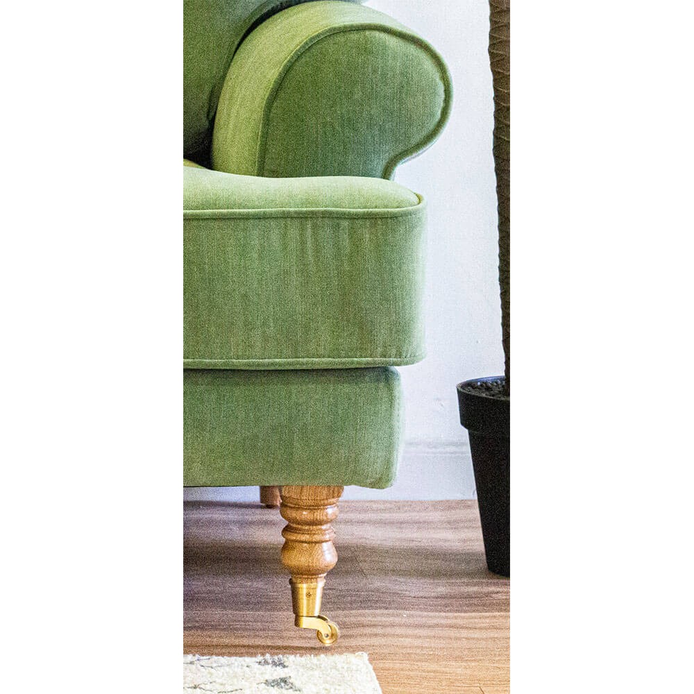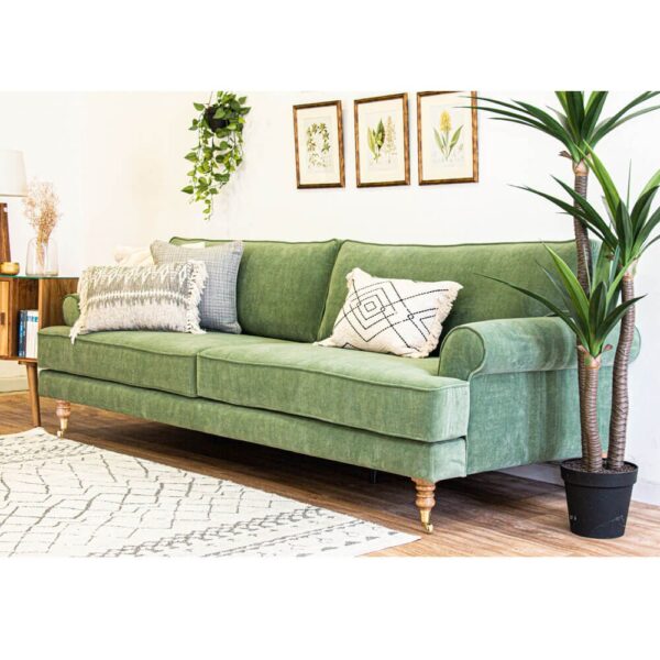 בעלת שתי כריות גב מאורכות, משענות צד מעוגלות ורגלי פסנתר
