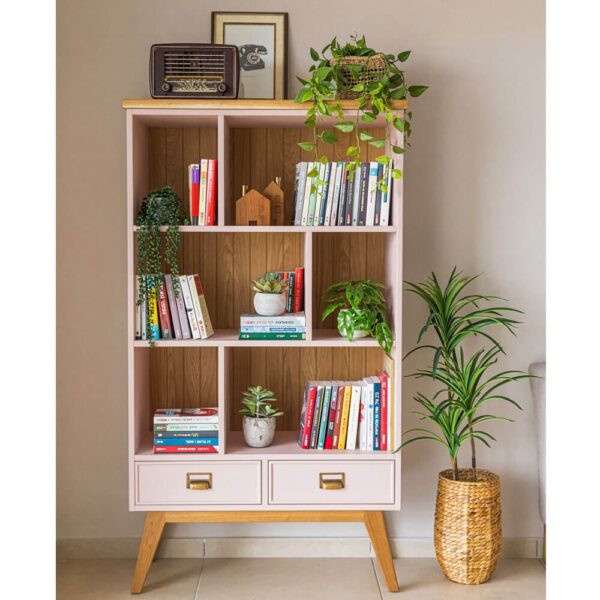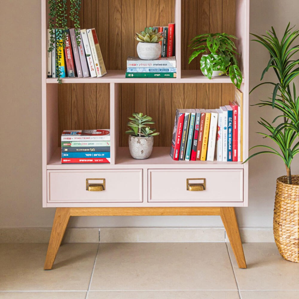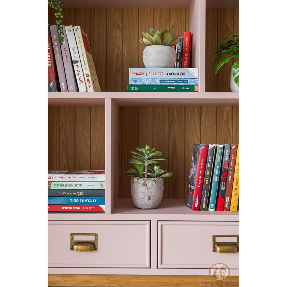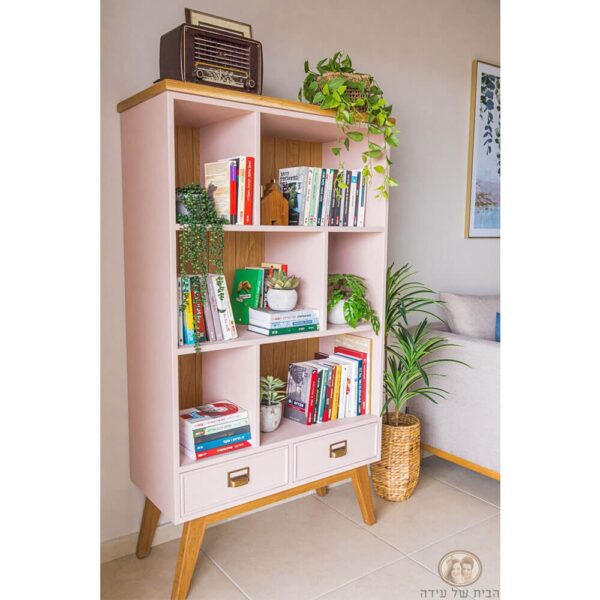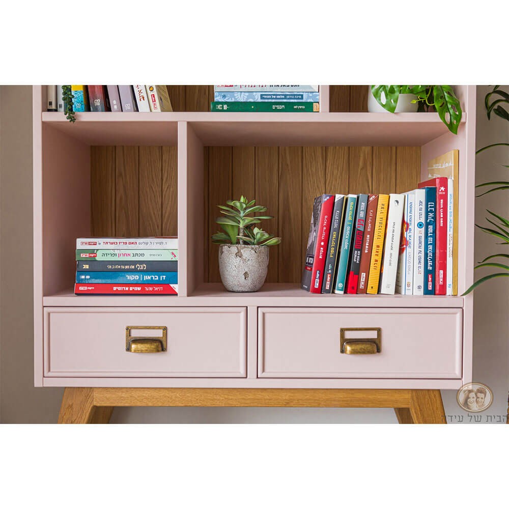 ספריה מעוצבת בקווים נקיים, עשויה עץ מלא, בעלת 3 מדפים, מחולקים ל5 תאים. בחלק התחתון שתי מגירות בעלות ידיות בגוון מוזהב ורגלים מעוצבות מעץ מלא
