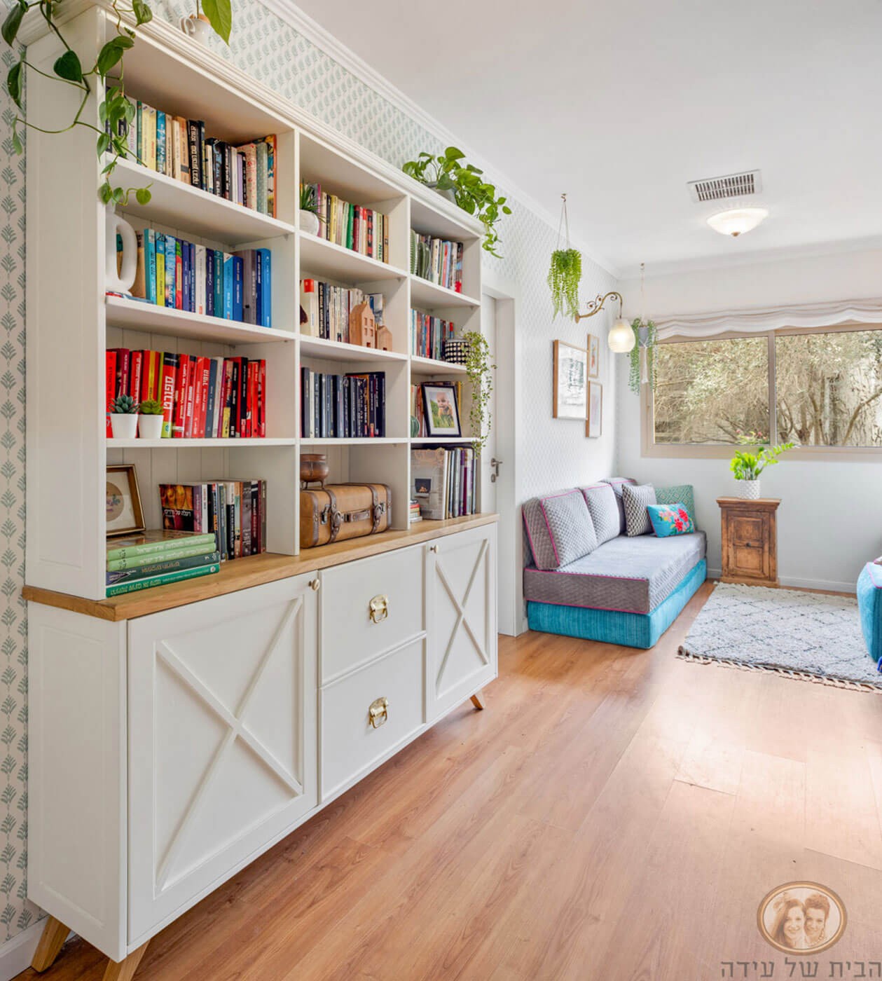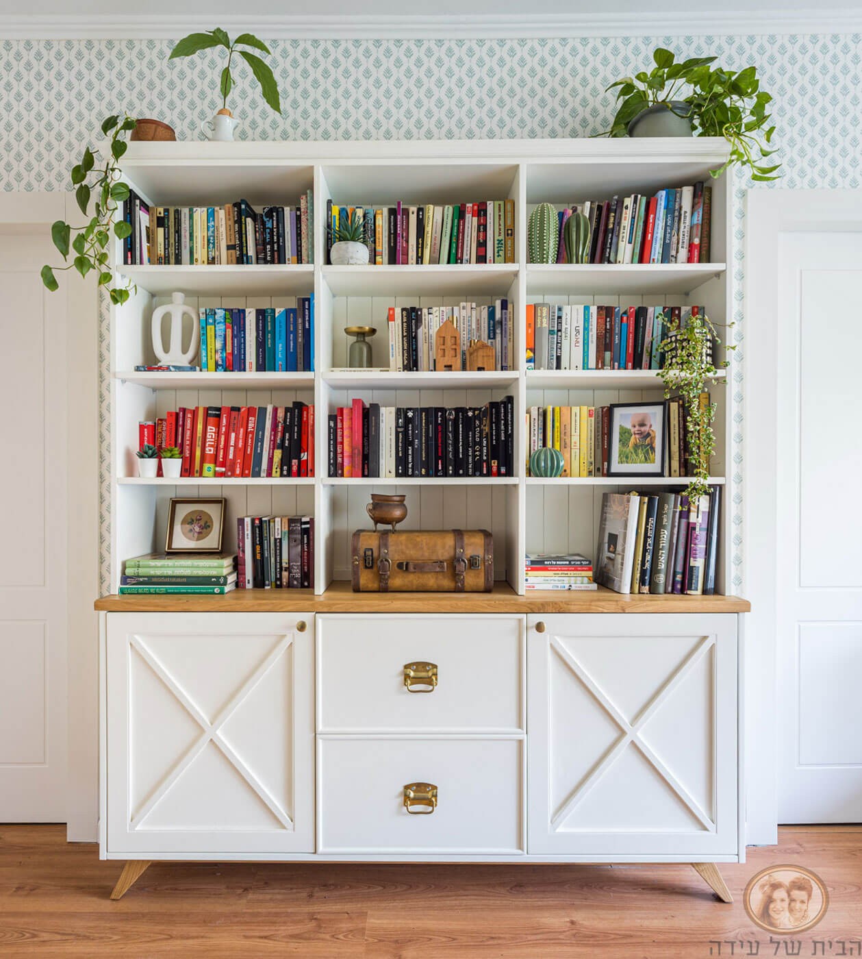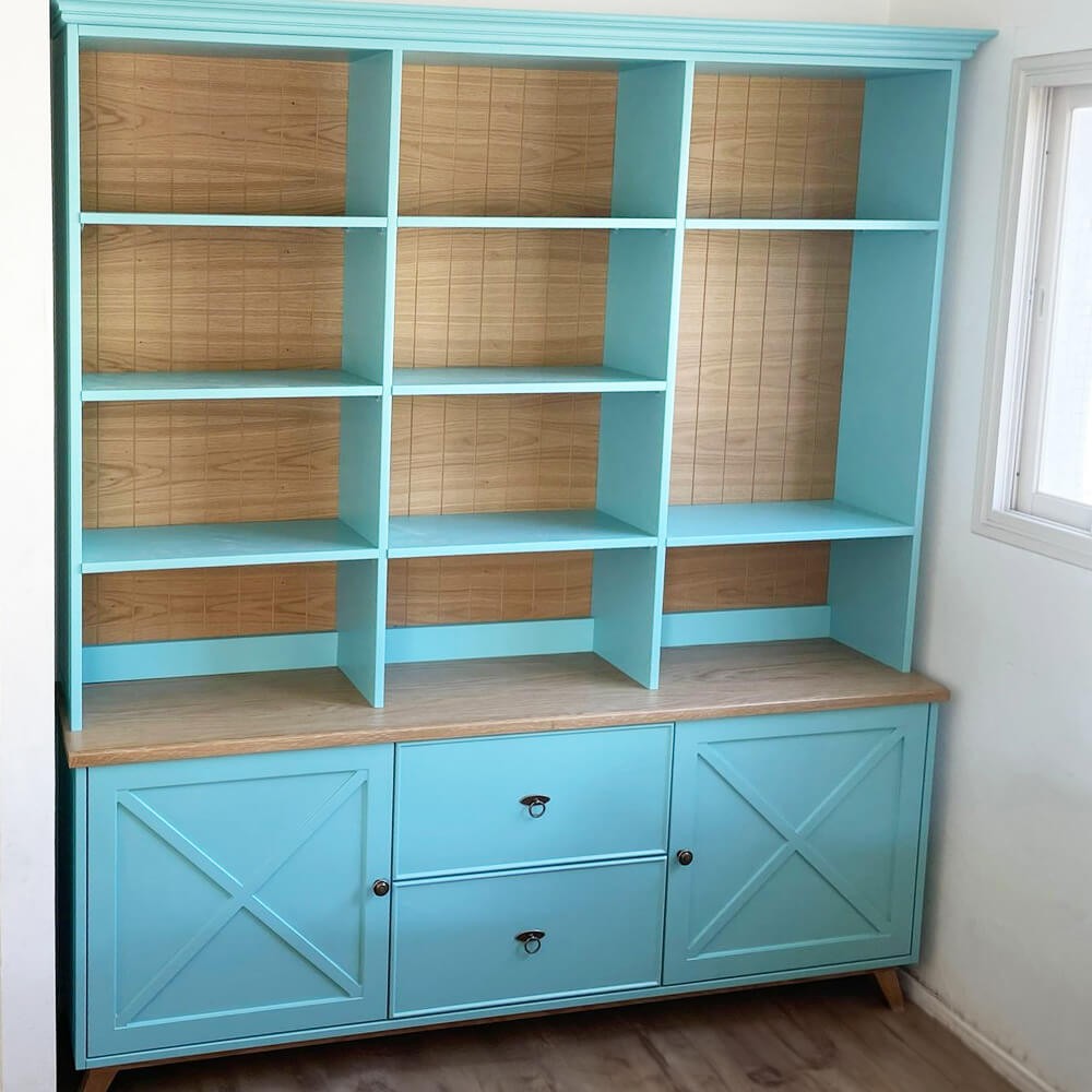 ארון ספרייה מעוצב בעל שני תאי אחסון ושתי מגירות מעוצבות, בשילוב מדפי תצוגה פתוחים במראה כפרי