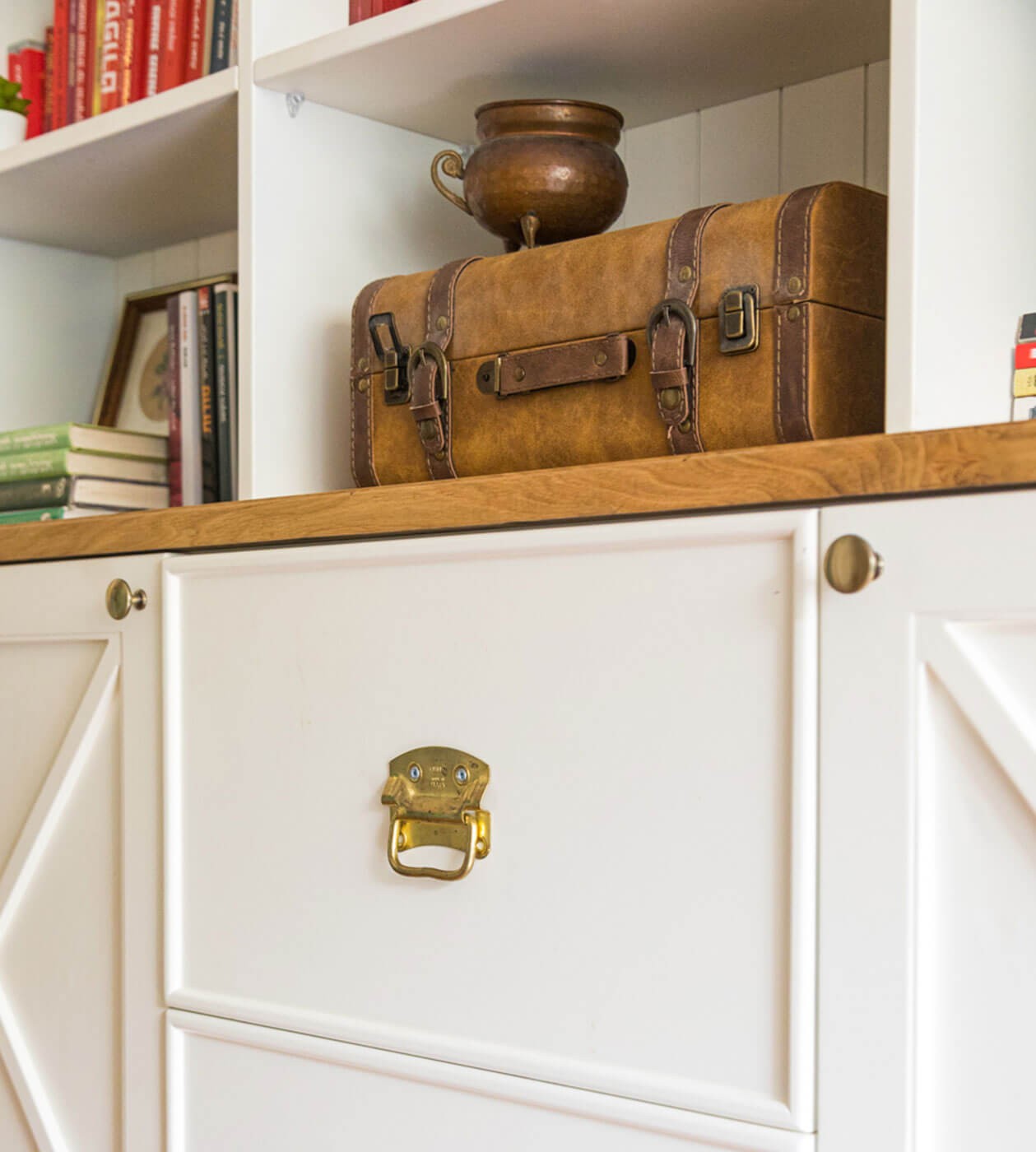 צבוע בגוון שמנת מעושנת, בשילוב ידיות בגוון פליז. תוספת עיצובית מושלמת לחללים רבים בבית