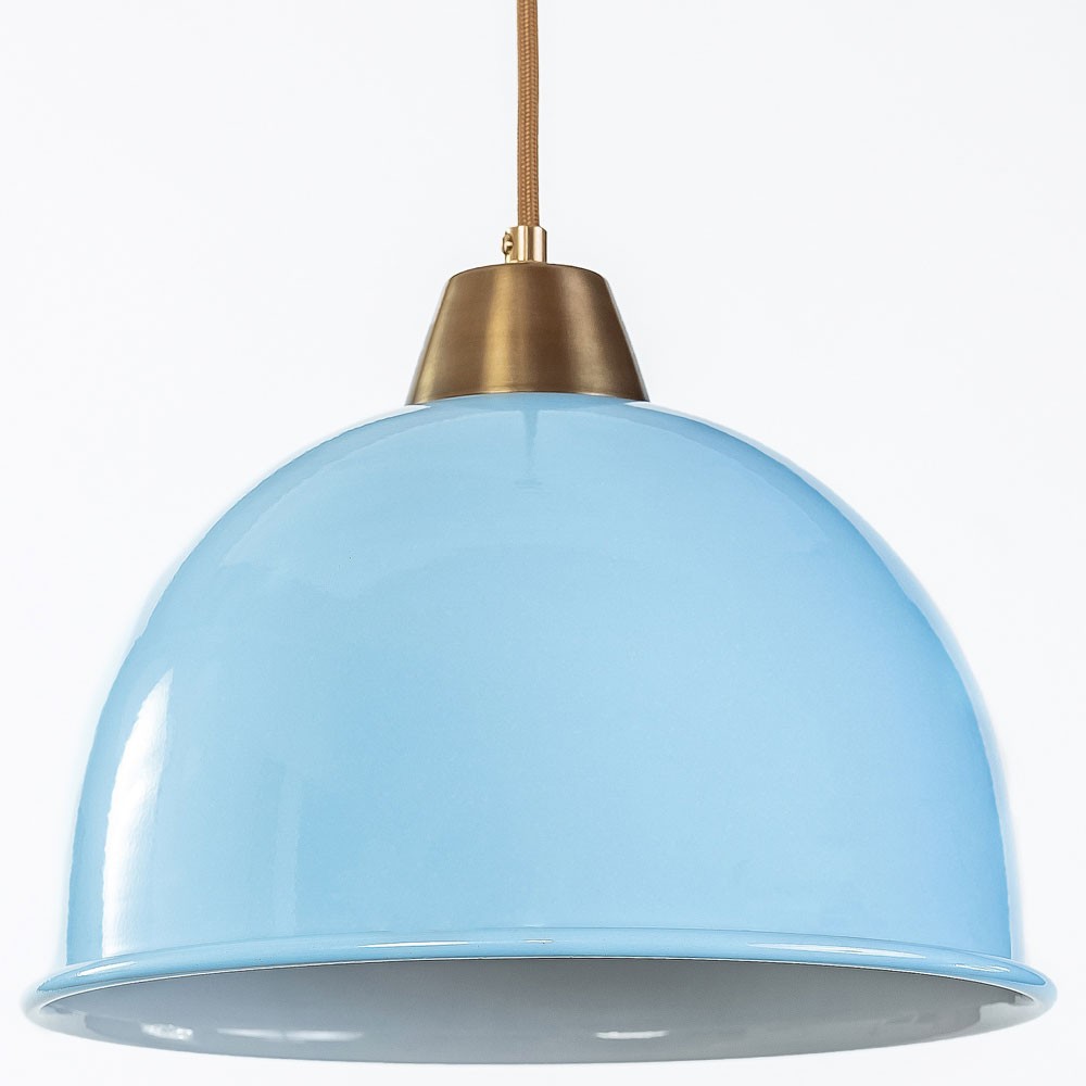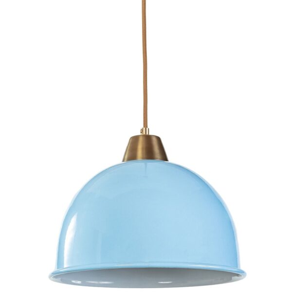 גוף תאורה תלוי בעל אהיל מתכת צבוע תכלת מבחוץ ולבן מבפנים.
