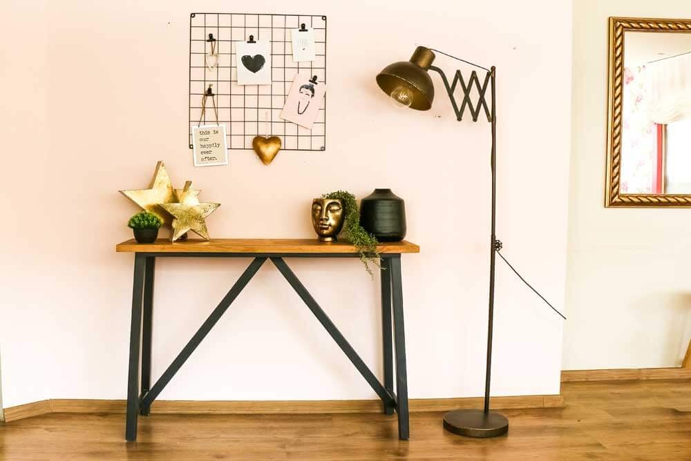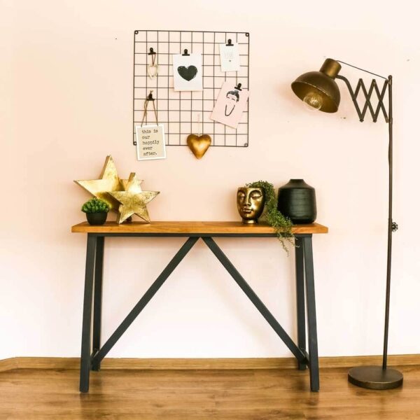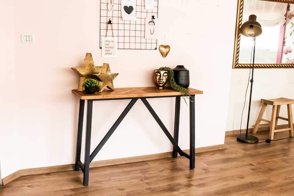 קונסולה מודרנית ומינימליסטית משלבת בחלקה העליון משטח עץ פורניר אלון