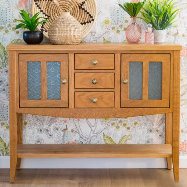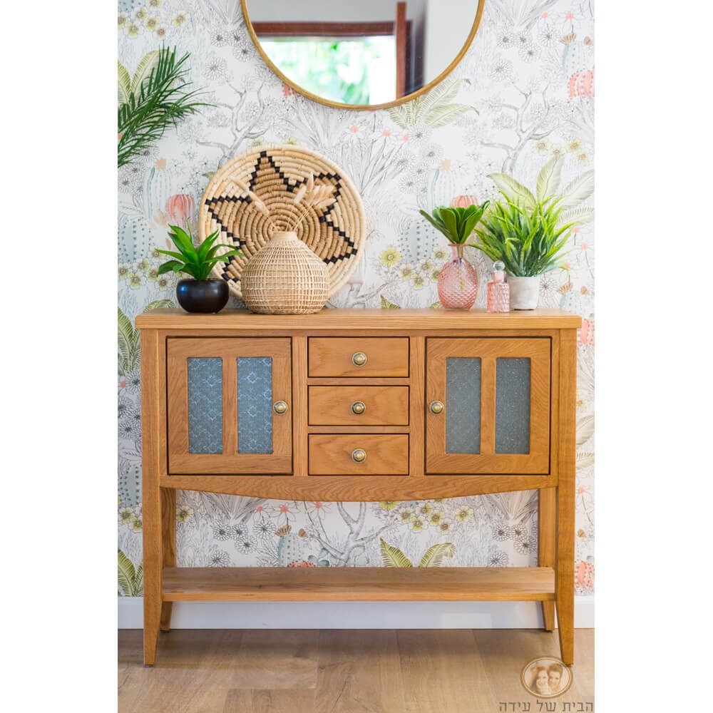 קונסולה עשויה עץ מלא עם משטח בשילוב פורניר אלון, בעלת מראה אלגנטי-כפרי