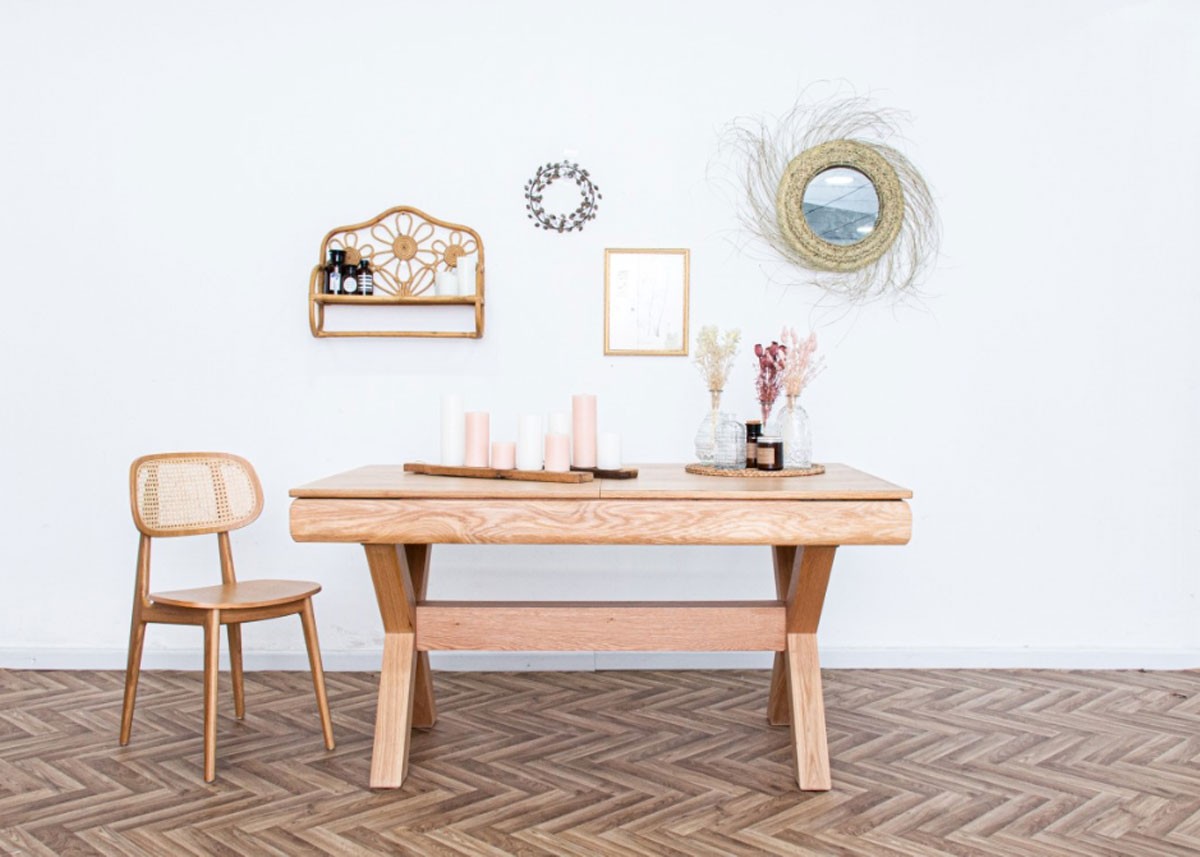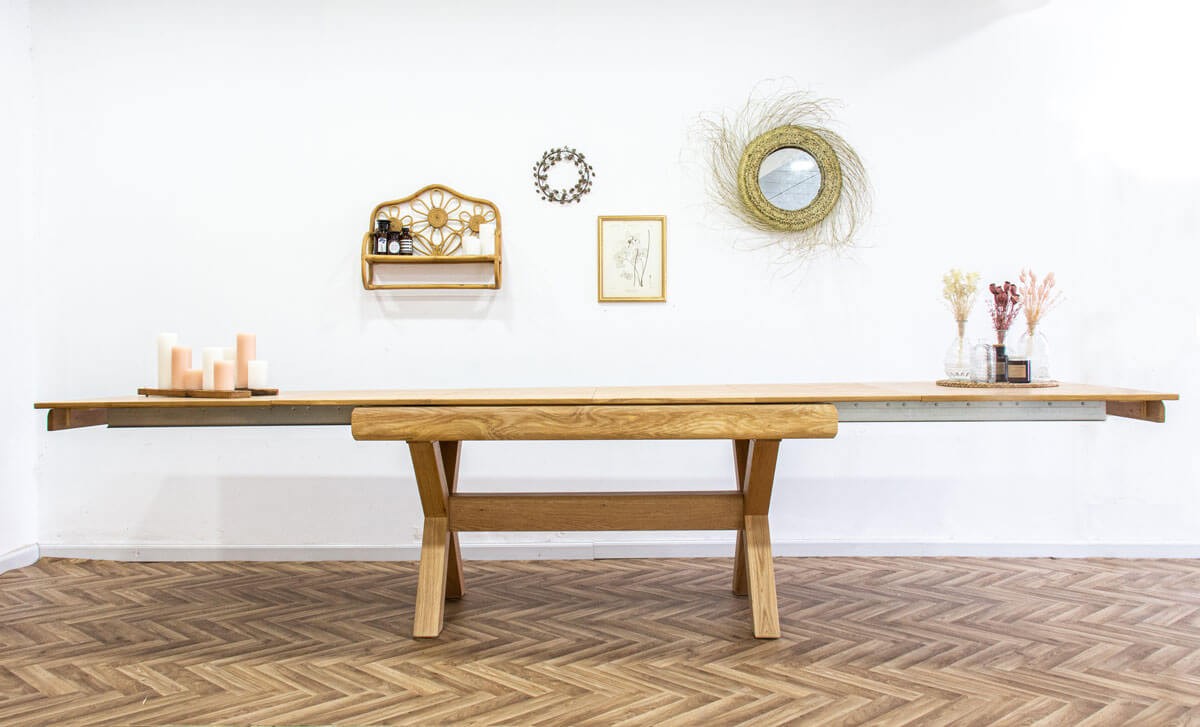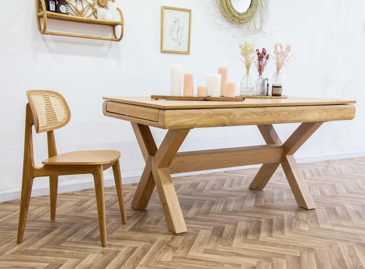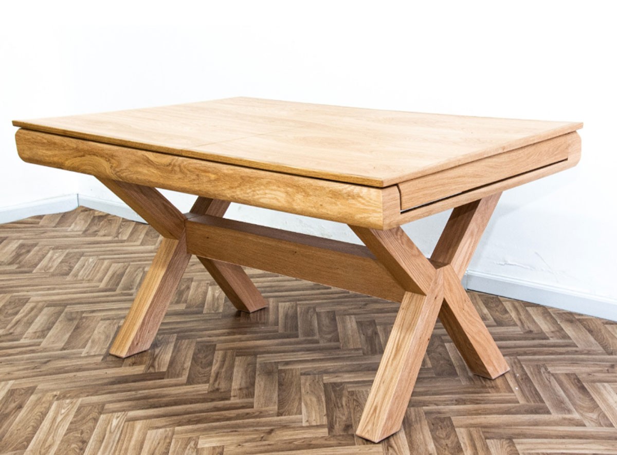 שולחן אוכל נפתח, עשוי פורניר אלון בשילוב אלון מלא
