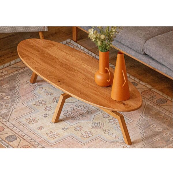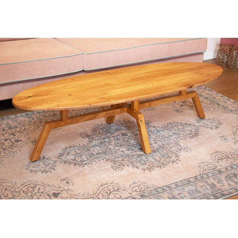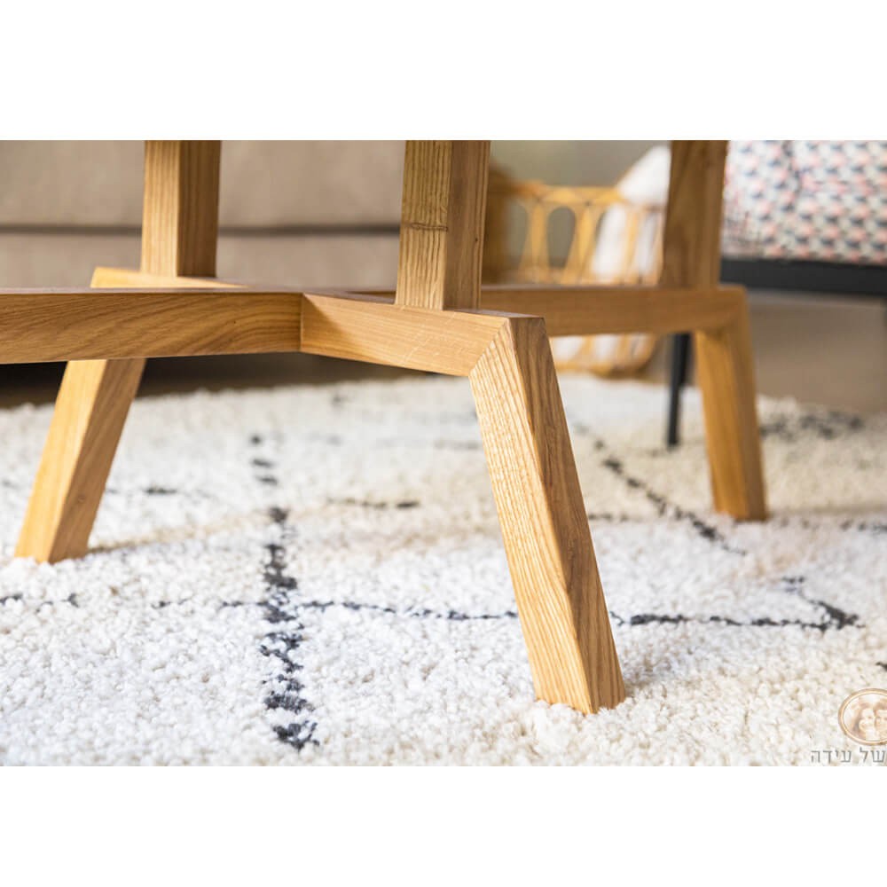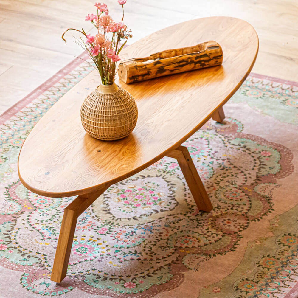 שולחן סלון עשוי עץ אלון מלא, בעל פלטה עליונה ורגליים מעוצבות