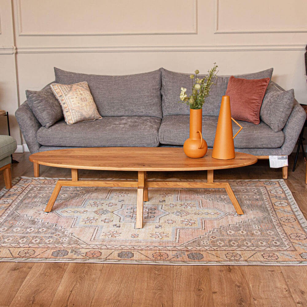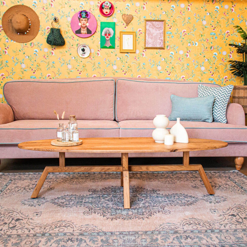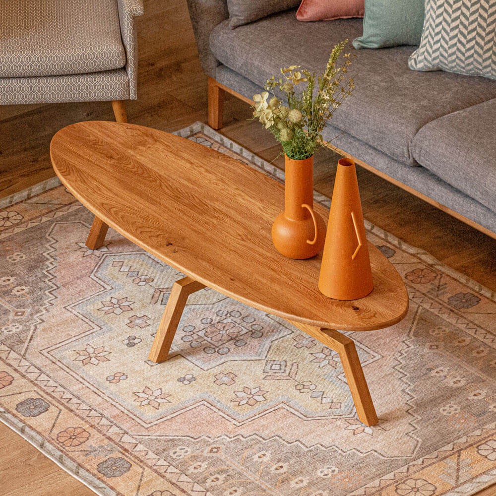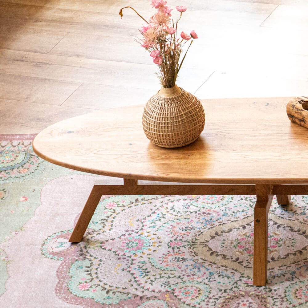 שולחן סלון עשוי עץ אלון מלא, בעל פלטה עליונה ורגליים מעוצבות