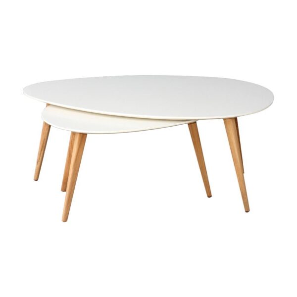 זוג שולחנות טיפה בגוון שמנת לסלון. השולחנות מיוצרים מעץ אלון מבוקע עם שילוב פורניר וצבועים בגוון שמנת עדין בשני גדלים המשתלבים יחד בהרמוניה מקסימה ומאפשרים גמישות עיצובית בהתאם לגודל הסלון. לשולחנות מבנה מעודן בסגנון רטרו עם שלוש רגליים ומשטח חלק. רהיט מקסים ואיכותי המתאים לאירוח ולעיצוב חלל המגורים בבית.