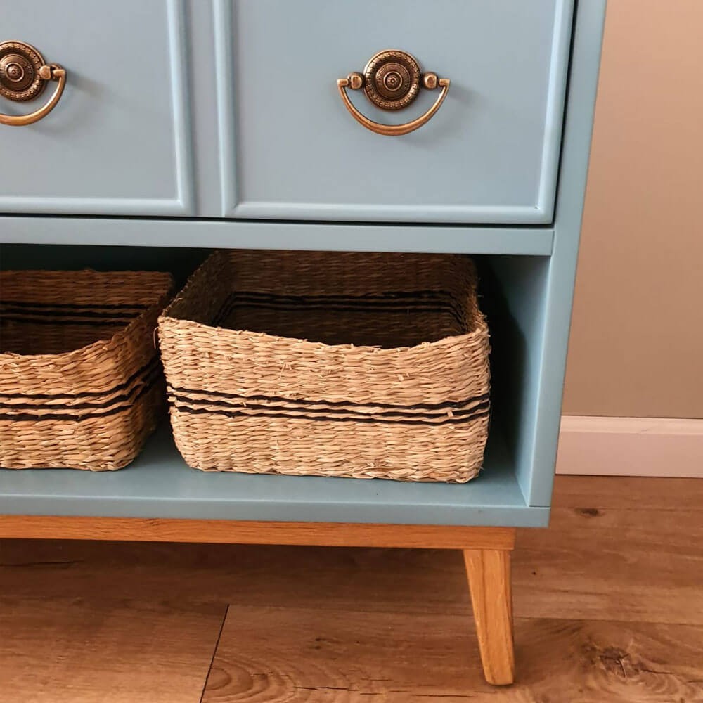 עשויה אם די אף, רגלי עץ אלון מלא וידיות פליז מעוצבות