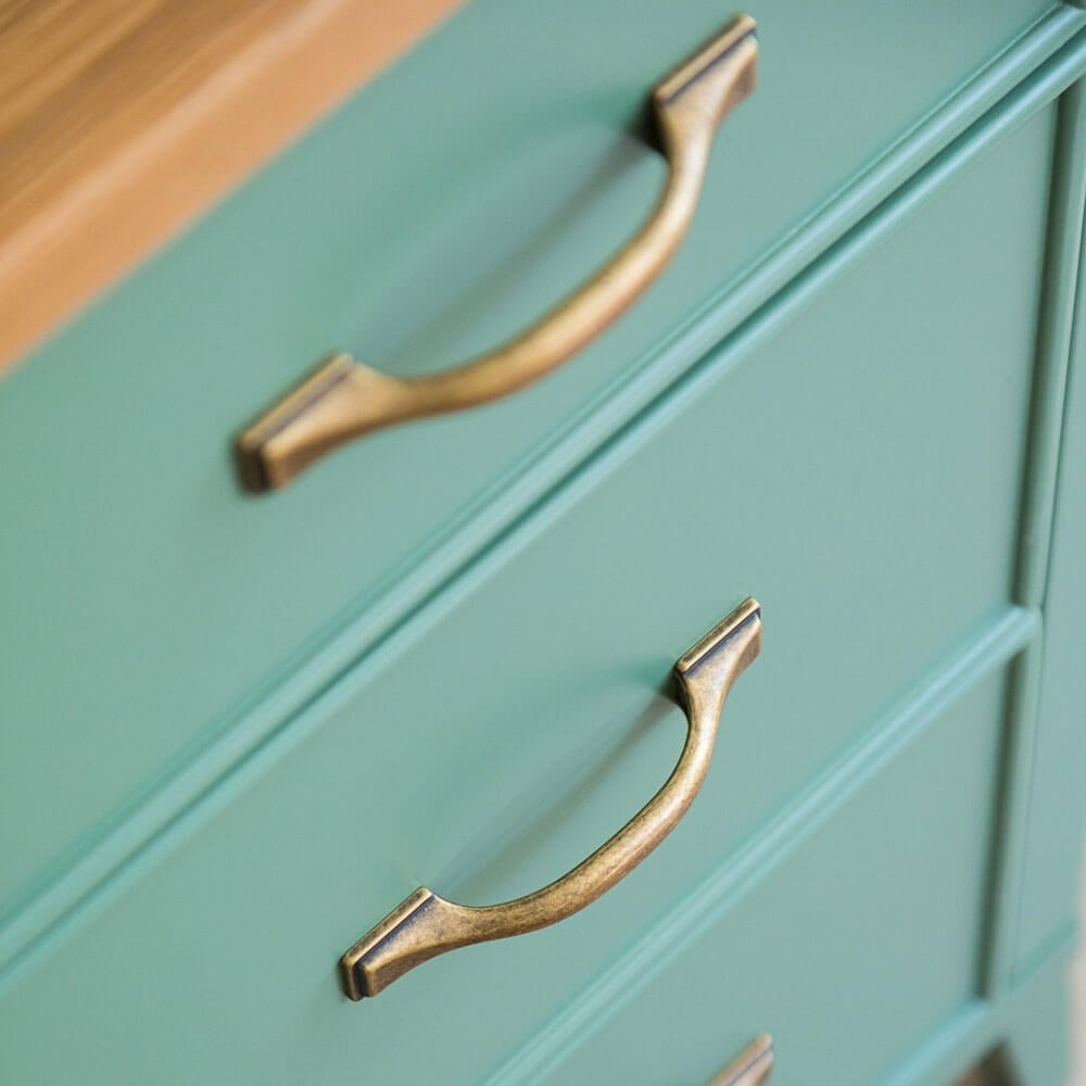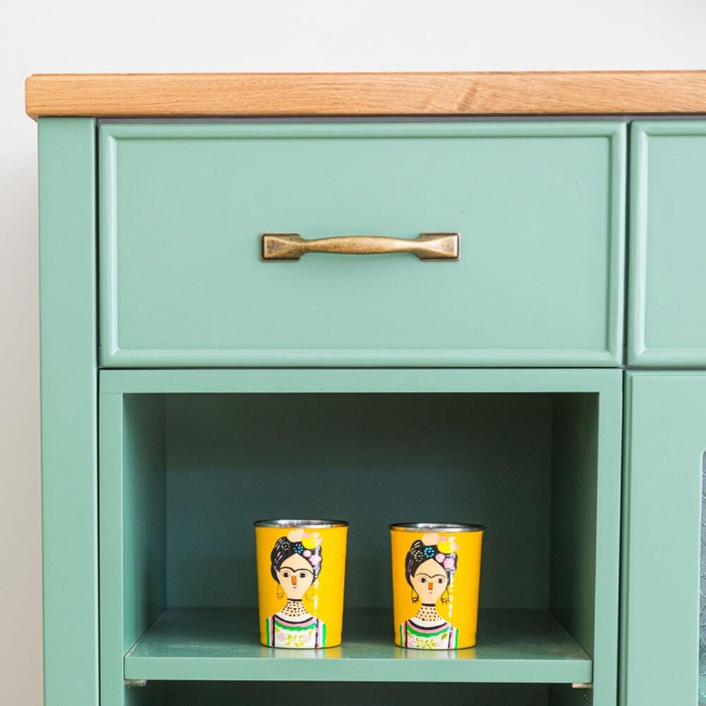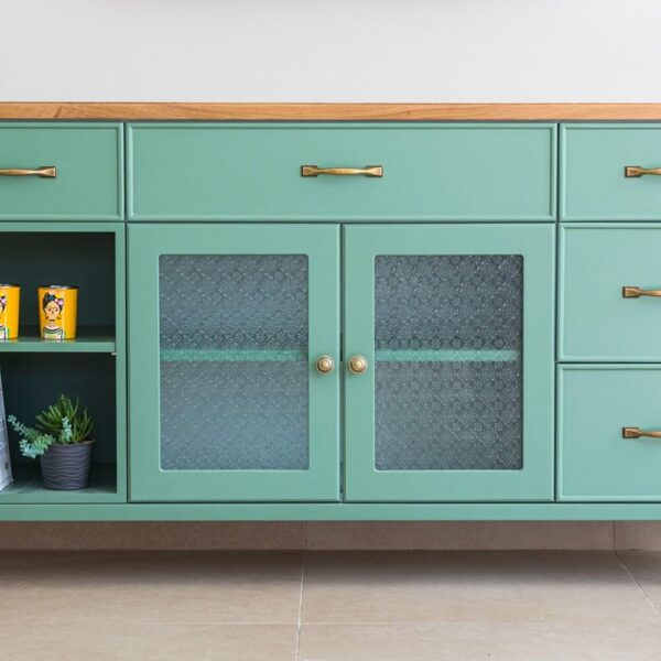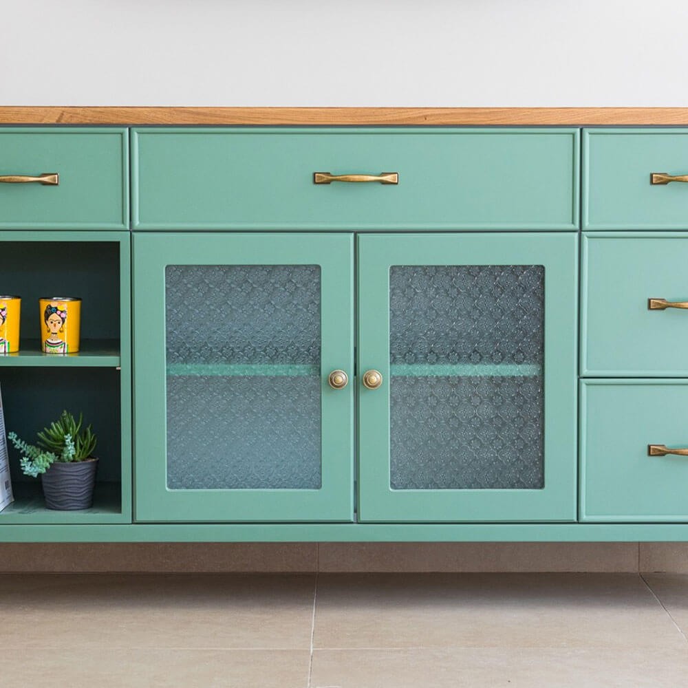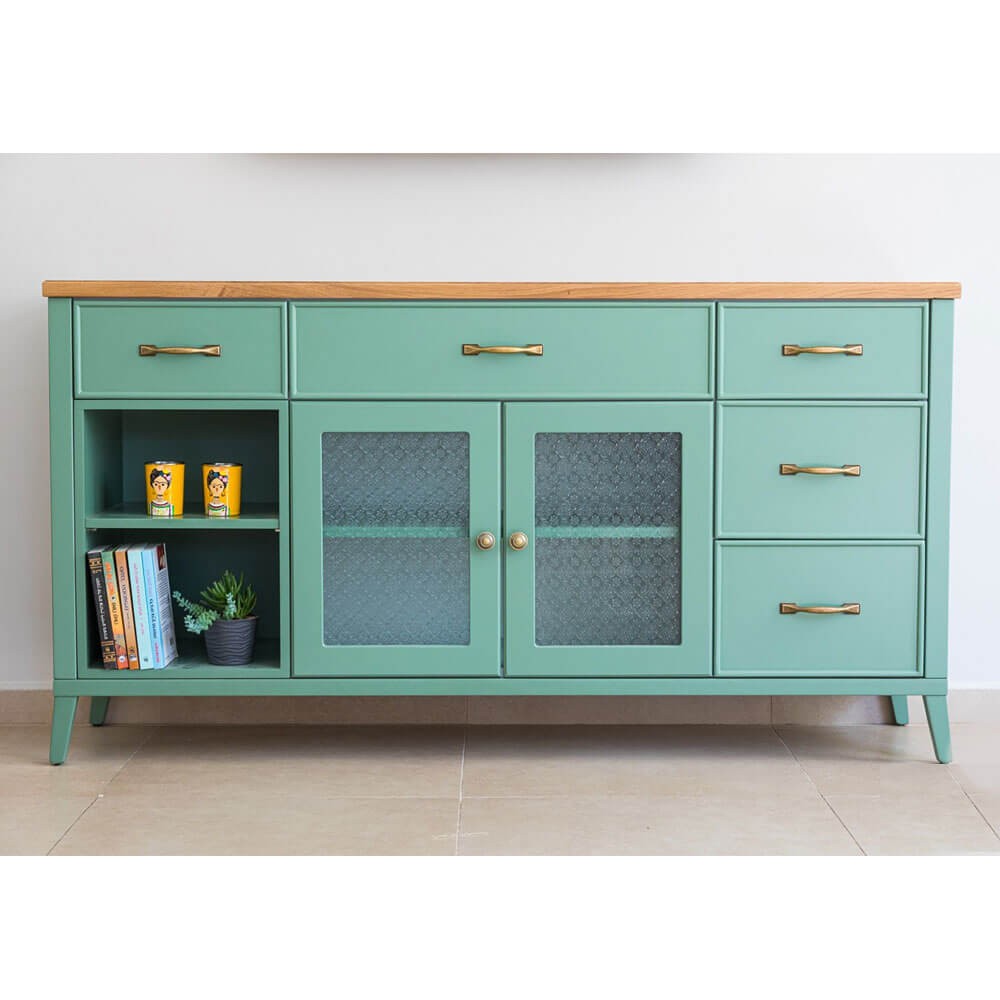 משולבת עם זכוכית סבתא וידיות בגוון פליז, עשויה מאם די אף ופלטה עליונה פורניר אלון