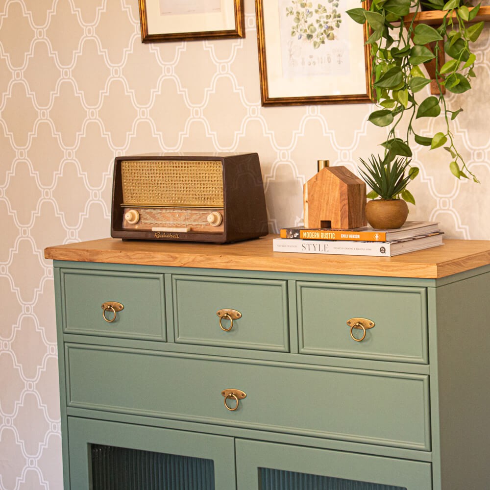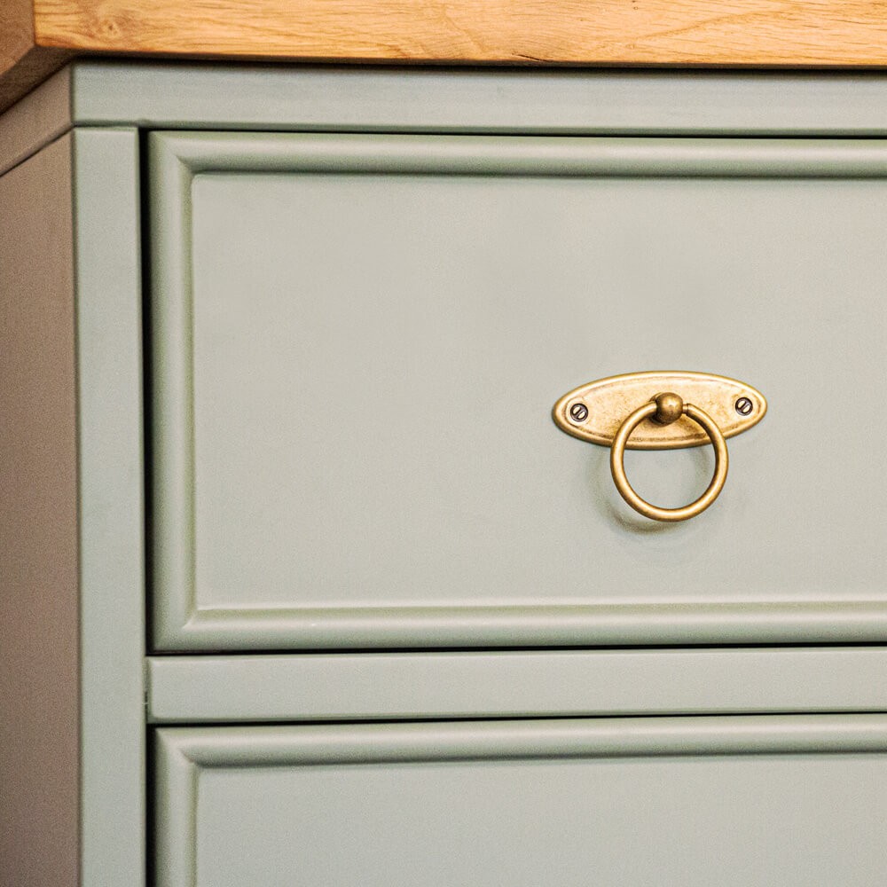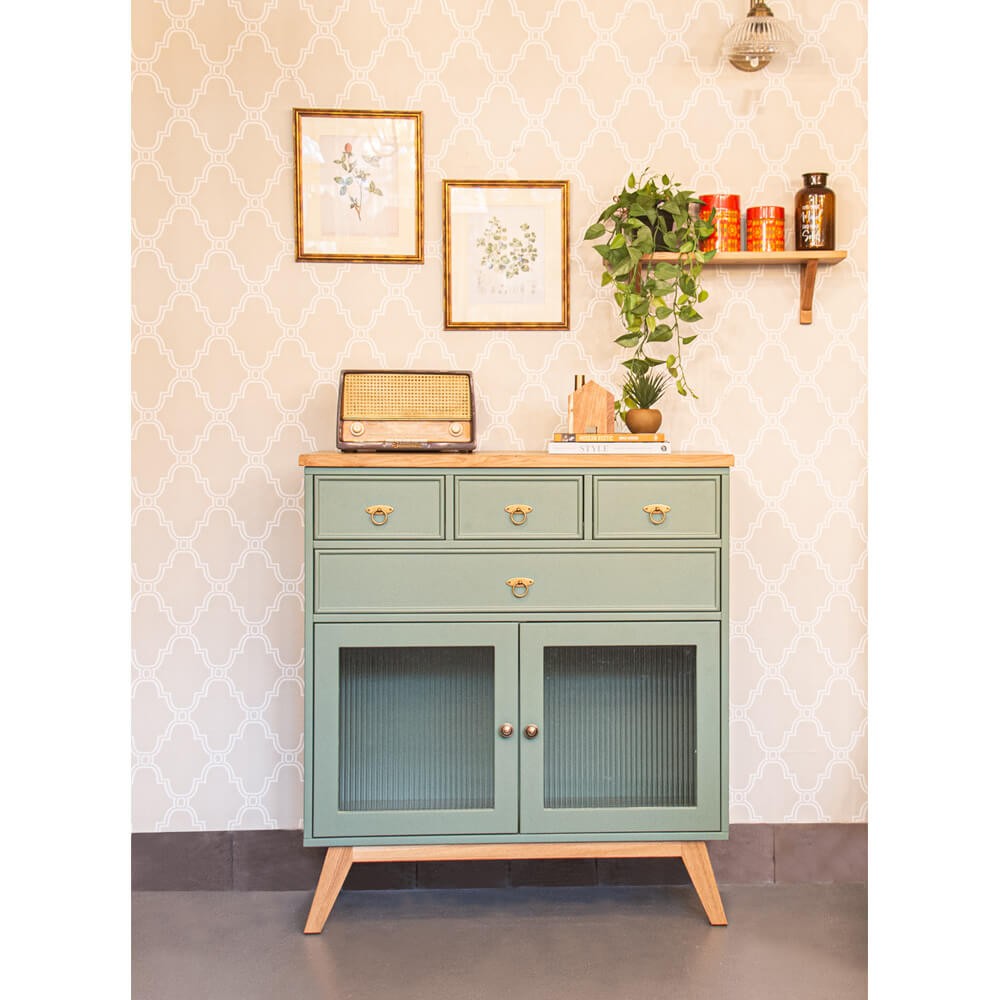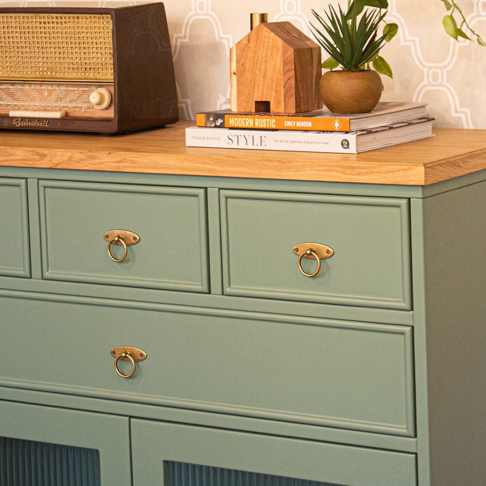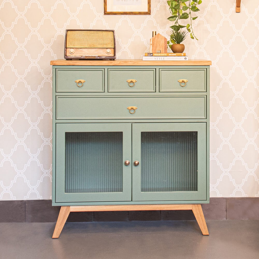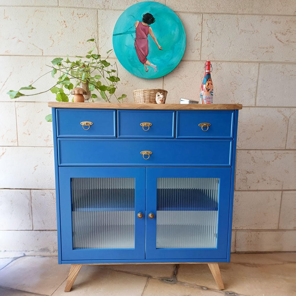 מיוצרת מאם די אף צבוע, פלטה עליונה מפורניר אלון ורגליים מעוצבות מאלון מלא. משולבת עם זכוכית גלים בדלתות, וארבע מגירות עם ידיות בסגנון עתיק בגוון פליז