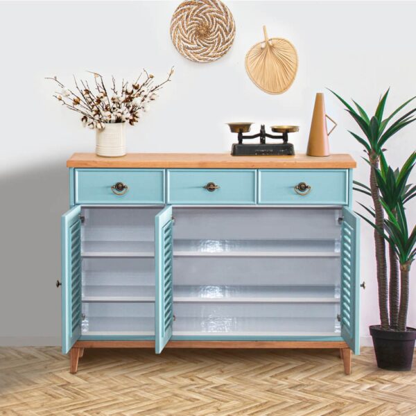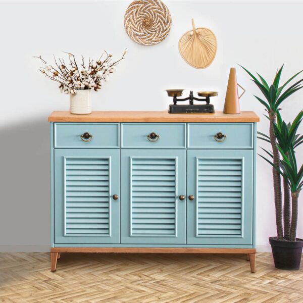 שידה מעוצבת קארי משולשת, שיקית ואלגנטית, בעלת 3 מגירות ו3 דלתות תריס היוצרות אוורור
